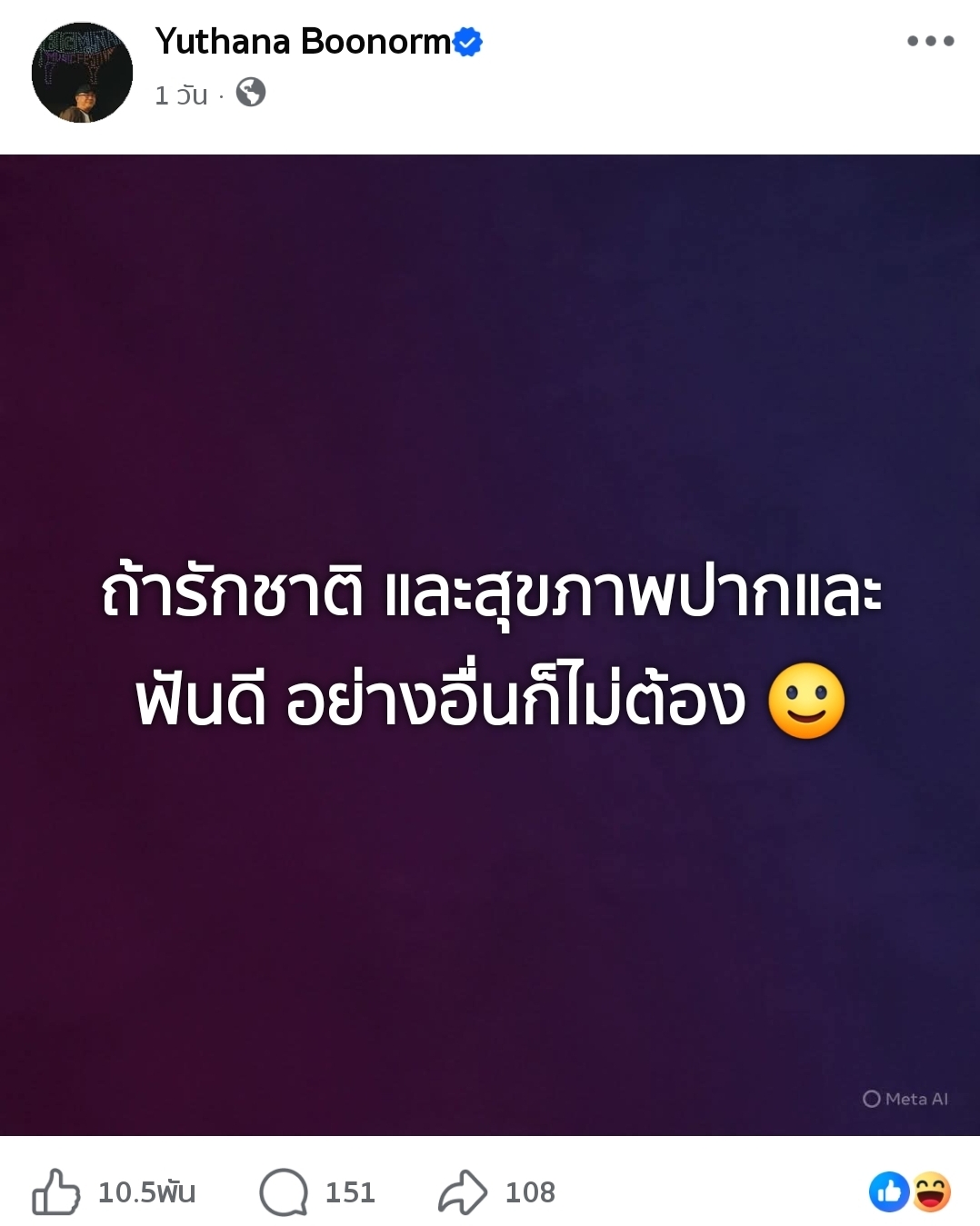 กลายเป็นเรื่องราวที่ทำเอาโลกโซเชียลต้องหยุดชะงักและหันมาให้ความสนใจกันอย่างล้นหลาม เมื่อเจ้าพ่อวงการอีเวนต์และคอนเสิร์ตชื่อดังอย่าง “ป๋าเต็ด-ยุทธนา บุญอ้อม” ได้ออกมาเคลื่อนไหวผ่านพื้นที่ส่วนตัวบน Facebook ด้วยการโพสต์ข้อความสั้นๆ แต่แฝงไปด้วยนัยสำคัญที่ชวนให้คนอ่านต้องนำไปตีความต่อ โดยข้อความดังกล่าวระบุว่า “ถ้ารักชาติ และสุขภาพปากและฟันดี อย่างอื่นก็ไม่ต้อง” พร้อมตบท้ายด้วยอีโมจิยิ้มที่ดูเหมือนจะเรียบง่ายแต่กลับทรงพลังอย่างประหลาด