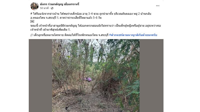 วันที่ 23 ก.พ. 2569 เพจเฟซบุ๊กชื่อ มังกร ร่วมกตัญญู เมืองกระหรี่ โพสต์ระบุว่า ได้รับแจ้งจากชาวบ้าน ได้พบร่างเด็กน้อย อายุ 3-4 ขวบ ถูกนำมาทิ้ง บริเวณคันคลอง หมู่2 บ้านกลับ อ.หนองโดน จ.สระบุรี คาดว่าน่าจะเสียชีวิตมาแล้ว 5-6 วัน