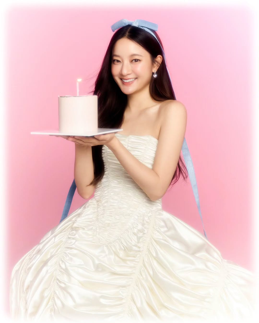 เห็นภาพแล้วต้องขยี้ตารัว ๆ เพราะปีนี้ #คูมอิ้งค์ ของเราอายุครบ 32 ปี บริบูรณ์แล้วจ้า! แต่ดูสิคะคุณขา… ความสดใส ความออร่ามันกระแทกตาจนนึกว่าเด็กมหาลัยเพิ่งเข้าวัย 20 ต้น ๆ เจ้าตัวมาในลุคสุดละมุนสวมชุดเดรสยาวเกาะอกสีขาวนวลตา งานระบายสุดหรูดูคุณหนูท่านหนึ่ง เพิ่มความคิวต์เลเวลสิบด้วยการผูกโบว์สีฟ้าเส้นยาวบนผม สไตล์เจ้าหญิงในเทพนิยายสุด ๆ ยืนถือเค้กก้อนเล็ก ๆ พร้อมรอยยิ้มพิมพ์ใจที่เห็นแล้วต้องละลาย