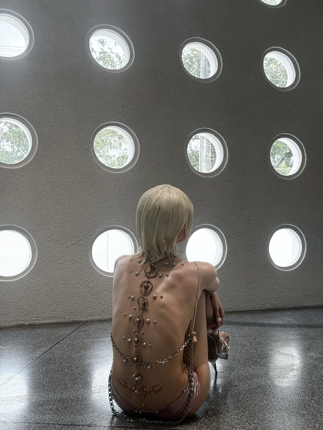 แต่สิ่งที่กลายเป็นจุดนำสายตาและถูกพูดถึงมากที่สุด คือรายละเอียดงานศิลปะบริเวณแผ่นหลังที่พลอยชมพูเลือกประดับด้วยเครื่องประดับรูปทรงทรงกลมและวงแหวนโลหะเรียงตัวตามแนวสันหลังอย่างประณีต เสริมด้วยรอยสักกราฟิกดีไซน์สุดเท่บริเวณเอว ซึ่งสะท้อนให้เห็นถึงความตั้งใจในการถ่ายทอดผลงานที่มากกว่าแค่ความสวยงาม แต่เป็นการสื่อสารถึงความเป็นศิลปินที่กล้าจะนำเสนอสิ่งใหม่
