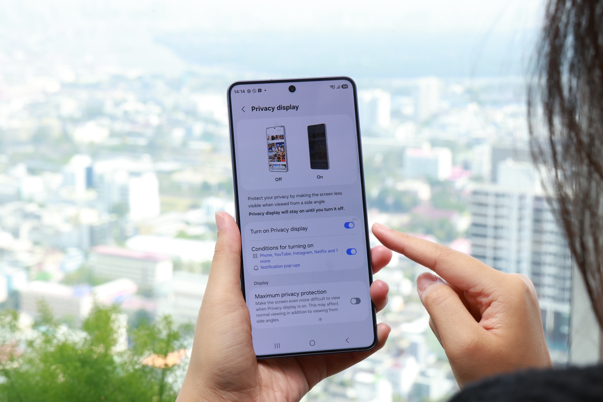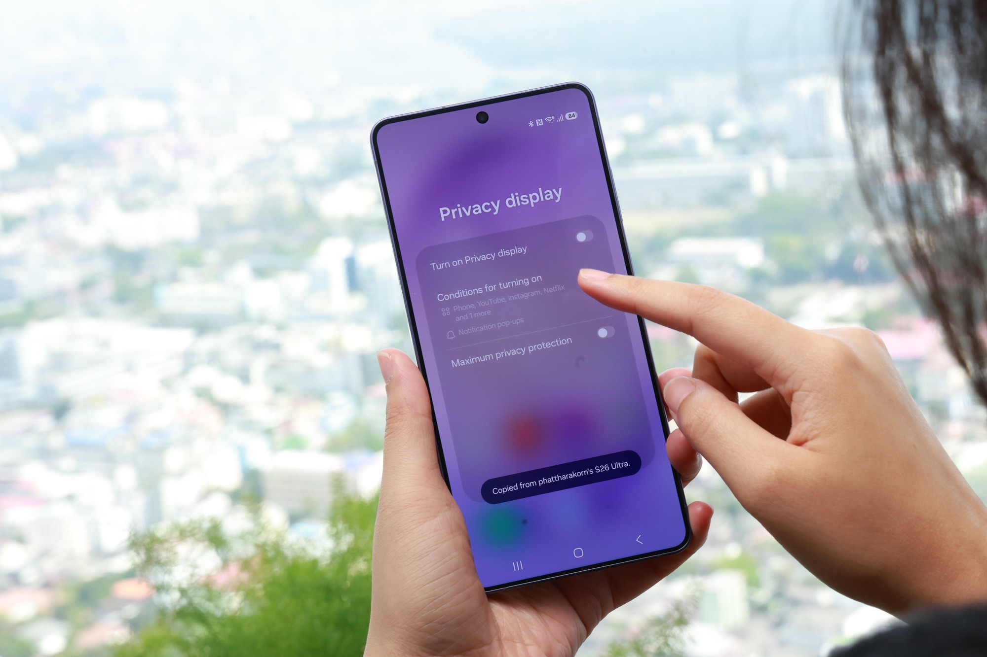 Galaxy S26 Ultra มาพร้อมกับ Privacy Display นวัตกรรมเพื่อปกป้องความเป็นส่วนตัว ที่ฝังในตัวเครื่องเป็นครั้งแรกของอุตสาหกรรมมือถือ ใช้การควบคุมการกระจายแสงของพิกเซล ลดการมองเห็นจากด้านข้าง ขณะเดียวกันยังคงความคมชัดและความสว่างสำหรับผู้ใช้ ซึ่งสามารถลดการมองเห็นได้จากรอบทิศทาง ไม่ว่าจะเป็นมุมด้านข้าง มุมด้านบน-ล่าง โดยผู้ใช้งานสามารถเลือกเปิด-ปิดการใช้งานได้ตามความต้องการ ไม่ว่าจะเป็น เลือกเปิดแบบป้องกันการมองเห็นทั้งหน้าจอ หรือเลือกเปิดป้องกันการมองเห็นเฉพาะบางส่วน เช่น การแจ้งเตือนหรือข้อมูลสำคัญ เพื่อเพิ่มความมั่นใจทุกครั้งที่ใช้งานในพื้นที่สาธารณะ
