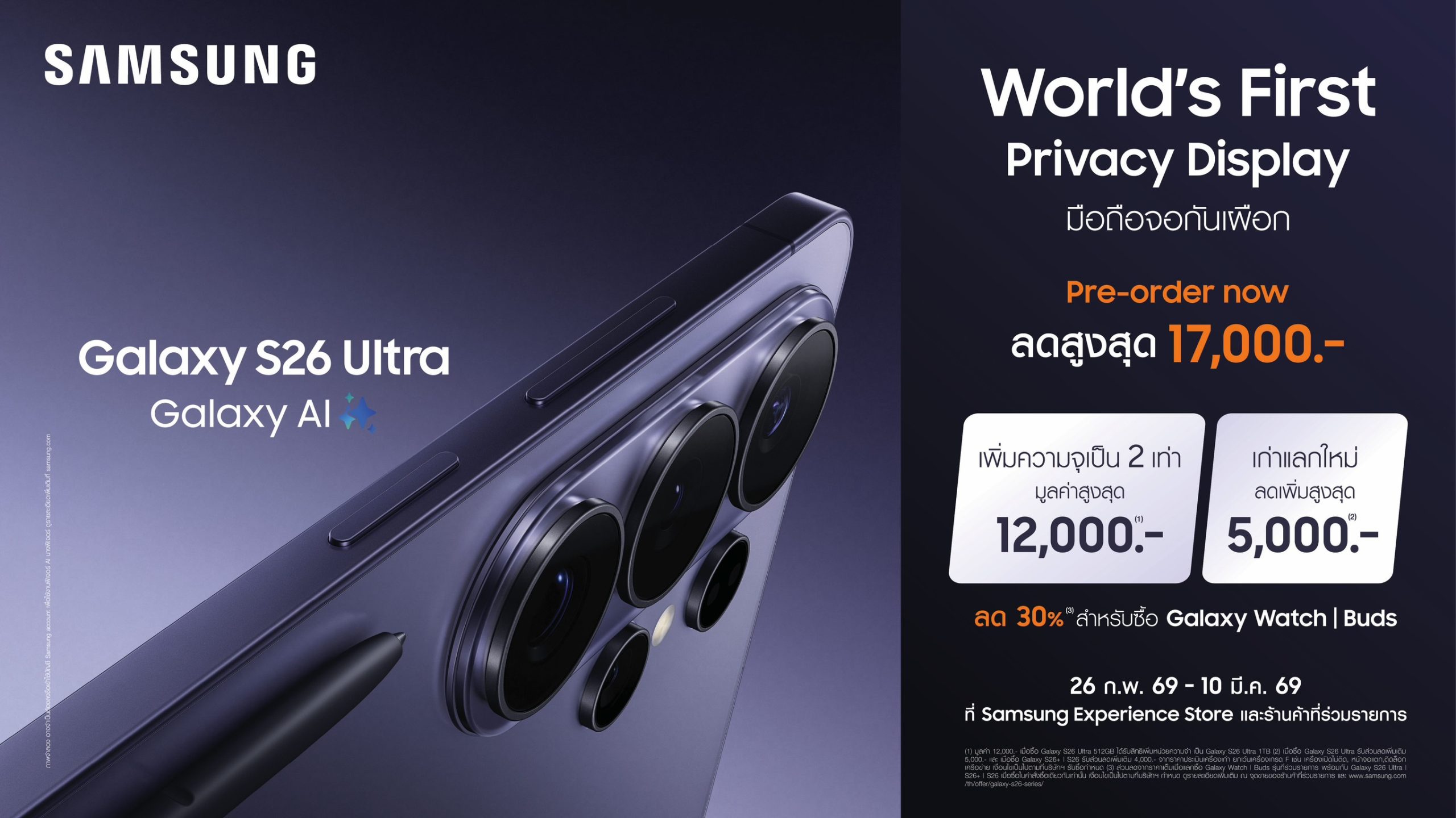 *สำหรับ Samsung Experience Store และร้านค้าที่ร่วมรายการเงื่อนไขเป็นไปตามที่บริษัทกำหนด ดูเพิ่มเติมได้ที่ https://smsngshop.com/s26-preorder-pr
