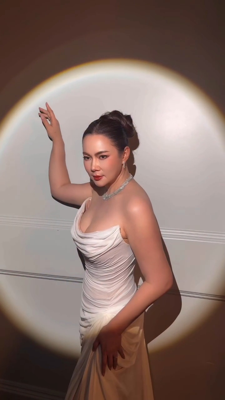 งานนี้บอกเลยว่าชาวเน็ตถึงกับต้องกดเครื่องคิดเลขคำนวณกันรัว ๆ เพราะตัวเลขวัย 50 ปี มันช่างสวนทางกับภาพที่เห็นเหลือเกิน! ชุดราตรีเกาะอกสีขาวที่เน้นสัดส่วนแบบเน้น ๆ โชว์ให้เห็นโค้งเว้าสุดพลังที่เขาเรียกกันว่า “หุ่นนาฬิกาทราย” ของจริง!