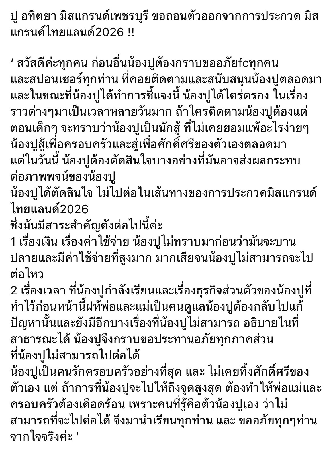 สำหรับเหตุผลหลัก ๆ ที่ทำให้ไม่สามารถไปต่อบนเส้นทางการประกวดปี 2026 ได้ มีทั้งเรื่องค่าใช้จ่ายที่บานปลายสูงเกินกว่าที่คาดคิด รวมถึงภาระหน้าที่ด้านการเรียนและธุรกิจครอบครัวที่ต้องกลับไปจัดการด้วยตัวเอง อีกทั้งยังมีบางเรื่องที่ไม่สามารถชี้แจงในที่สาธารณะได้