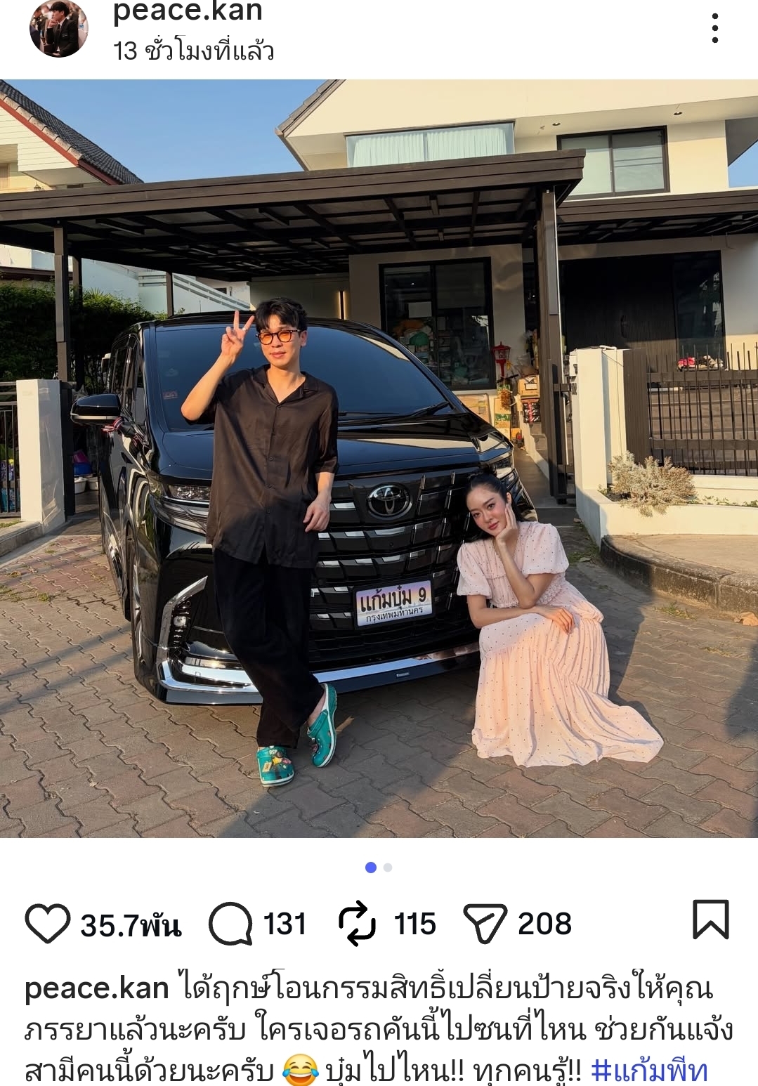 ”ได้ฤกษ์โอนกรรมสิทธิ์เปลี่ยนป้ายจริงให้คุณภรรยาแล้วนะครับ ใครเจอรถคันนี้ไปชนที่ไหน ช่วยกันแจ้งสามีคนนี้ด้วยนะครับ บุ๋มไปไหน!! ทุกคนรู้!! #แก้มพีท”