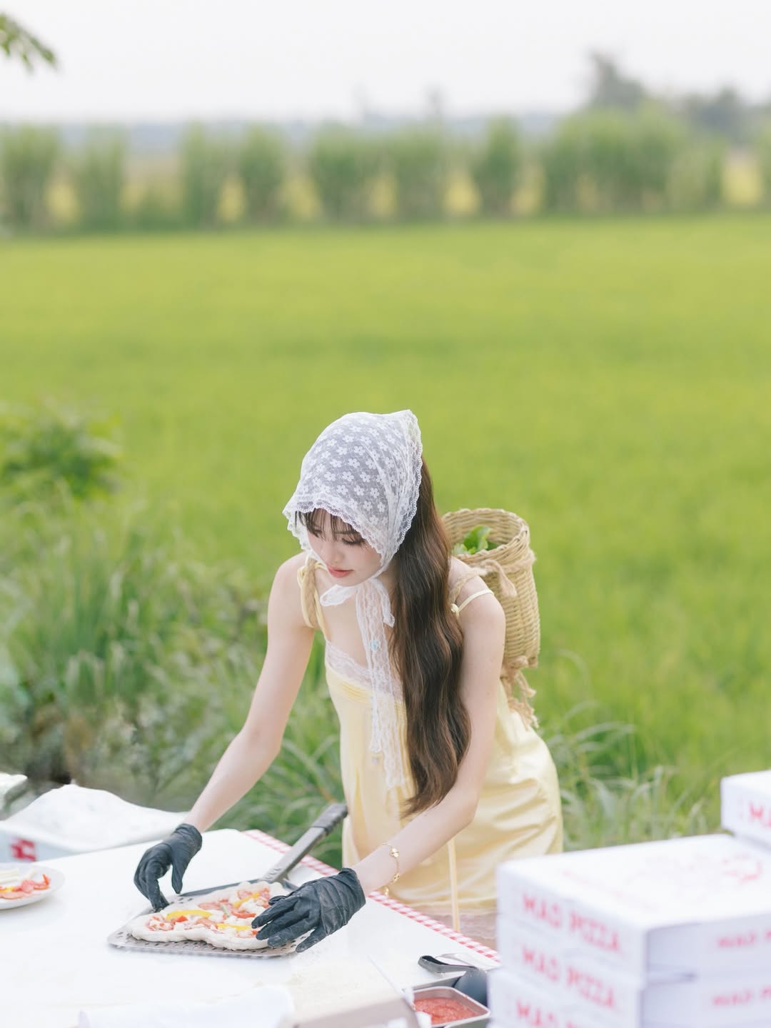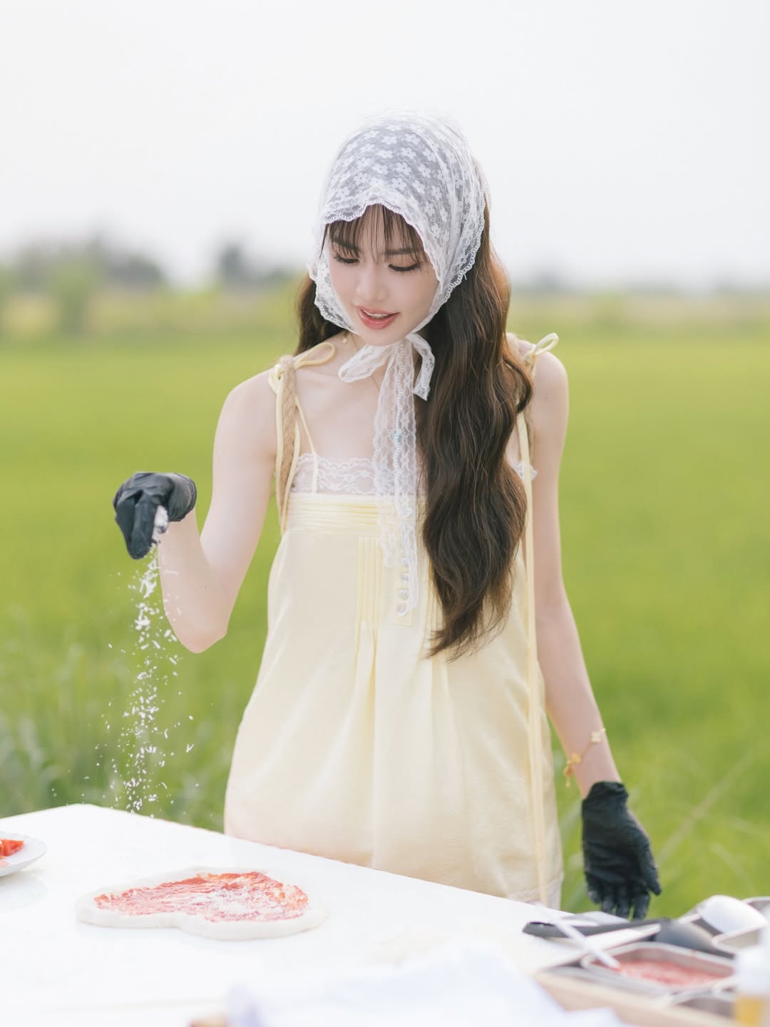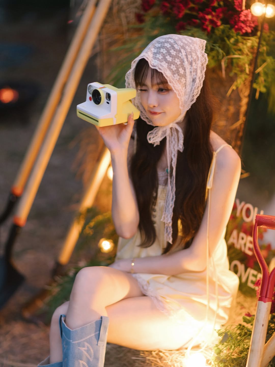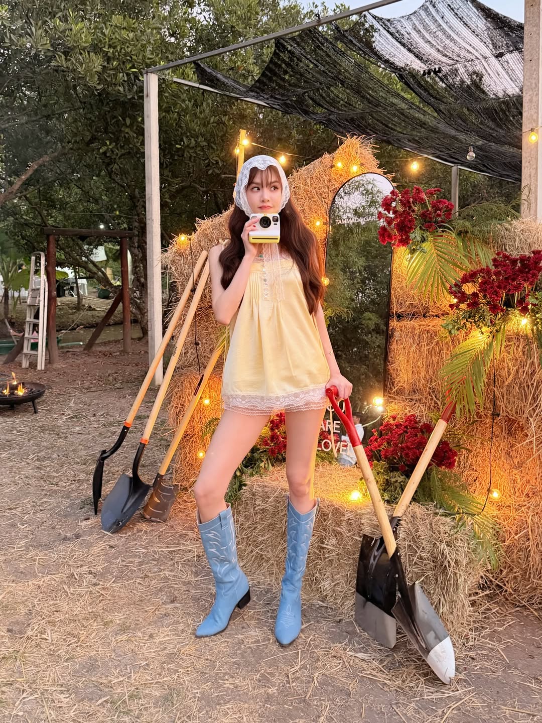 ​มาส่องคอสตูมของชีกันหน่อยค่ะ รอบนี้ชีเกรซเลือกสวมชุดกระโปรงสั้นสีเหลืองพาสเทลละมุนตา แต่งขอบลูกไม้ขาวสุดคิวท์ เพิ่มความเก๋ด้วย ผ้าโพกหัวลูกไม้ (Babushka Scarf) ที่กำลังฮิตอินเทรนด์สุดๆ แถมยังแมตช์เข้ากับ รองเท้าบูทคาวบอยสีฟ้า ทรงสูงที่ดูขัดแย้งแต่ลงตัวแบบงงๆ จนออกมาเป็นแฟชั่นนิสต้าตัวแม่กลางทุ่งผัก!