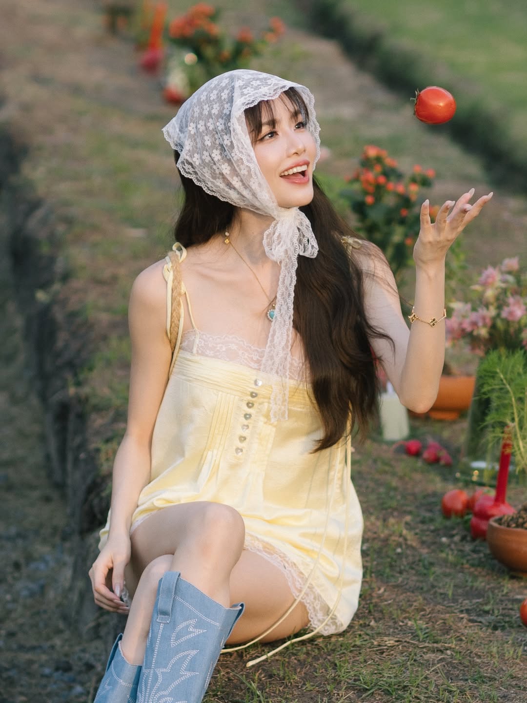 งานผิวของชีเกรซไม่ต้องพูดถึงค่ะ ขาวผ่องออร่าสู้แดดสู้ลมสุดๆ ไม่ว่าจะท่าโยนมะเขือเทศแบบเผลอๆ (ที่ดูรู้เลยว่าตั้งใจสวย!) หรือท่าโพสนั่งเหยียดขาโชว์เรียวสวยริมคันนา ทุกอย่างมันดู “ชิลล์เว่อร์” และ “ชีวิตดี” จนแฟนคลับพากันกดไลก์รัวๆ จนไอจีแทบค้าง!