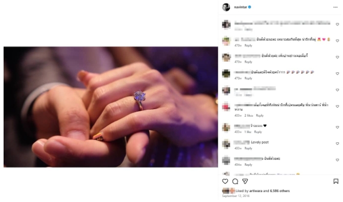 กระทั่งเมื่อวันที่ 12 ก.ย. 59 นาวินต้าร์ โพสต์ภาพชายหญิงจับมือกัน โดยมือของผู้หญิงสวมแหวนเพชรเม็ดโตไว้ที่นิ้วนางข้างซ้าย พร้อมแท็กชื่อไอจี ไฮโซน้ำหวาน พัสวี ขณะที่ทางผู้จัดการส่วนตัวของ นาวิน ต้าร์ ก็ได้เข้ามาแสดงความยินดีที่ใต้โพสต์ด้วย นอกจากนั้นทาง ไฮโซน้ำหวาน ก็โผล่คอมเมนต์แบบเขิน ๆ ว่า “ไม่ได้เป็นแฟนกันซะงั้น” หลังจากนั้นก็มีข่าวลือวงในออกมายืนยันว่า “ทั้งคู่หมั้นกันแบบสายฟ้าแล่บเรียบร้อยแล้ว หลังคบหาดูใจกันได้เพียง 4 เดือนเท่านั้น”