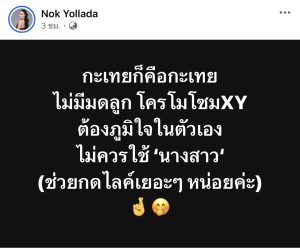 โดยในภาพข้อความที่มีการแชร์ต่อกันอย่างกว้างขวางระบุเนื้อหาใจความสำคัญว่า กะเทยก็คือกะเทยไม่มีมดลูก โครโมโซมXYต้องภูมิใจในตัวเอง ไม่ควรใช้ ‘นางสาว’ (ช่วยกดไลค์เยอะๆ หน่อยค่ะ)