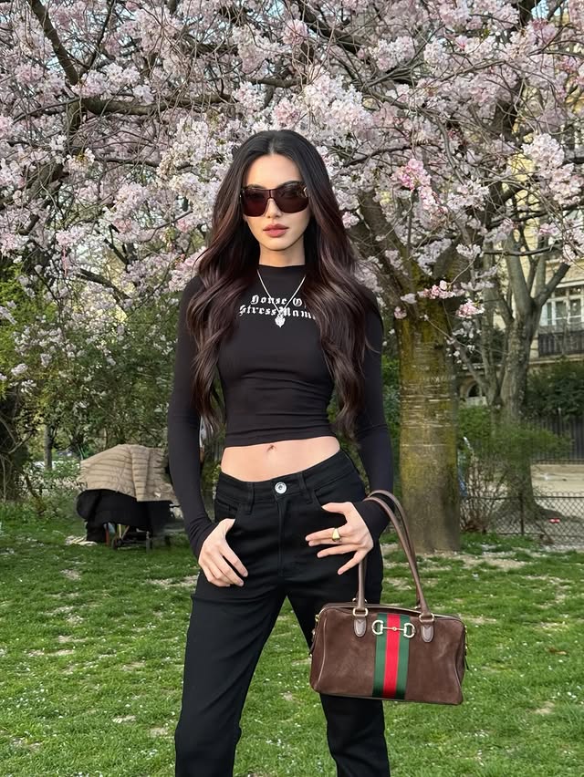 โดยในลุคนี้ ใหม่มาในสไตล์เรียบเท่ สวมเสื้อครอปแขนยาวสีดำเข้ารูป แมตช์กับกางเกงสีดำ พร้อมแว่นกันแดดสุดชิค และกระเป๋าหนังสุดหรู เพิ่มความแฟชั่นนิสต้าให้กับลุคนี้ได้อย่างลงตัว ขณะที่ฉากหลังเป็นดอกซากุระสีชมพูที่กำลังบานสะพรั่ง ยิ่งทำให้ภาพดูสวยละมุนและมีเสน่ห์มากขึ้น