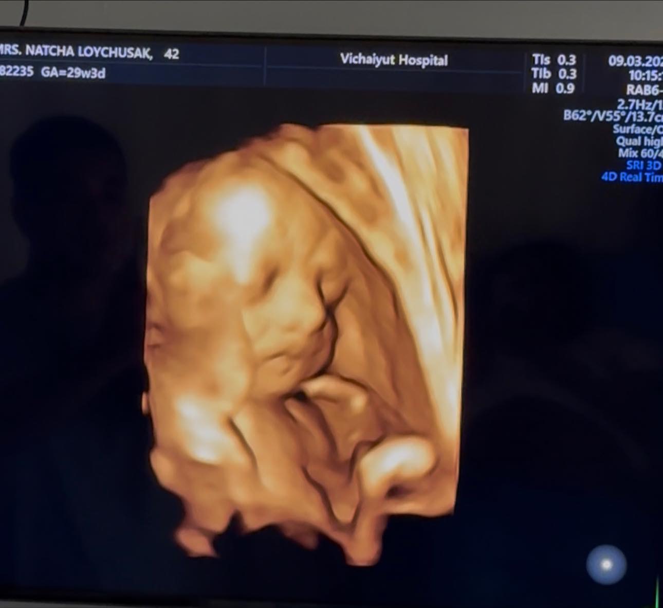 “น้องมีเมตตา ในวัย 29 สัปดาห์ 4 วัน พัฒนาการดีตามเกณฑ์ น้องกลับหัวแล้ว ดูทรงท่าจะขี้อ้อนปะป๊าเหมือนพี่สาวเธอแน่ ๆ ปะป๊าเตรียมใจละลายอีกคูณสอง”