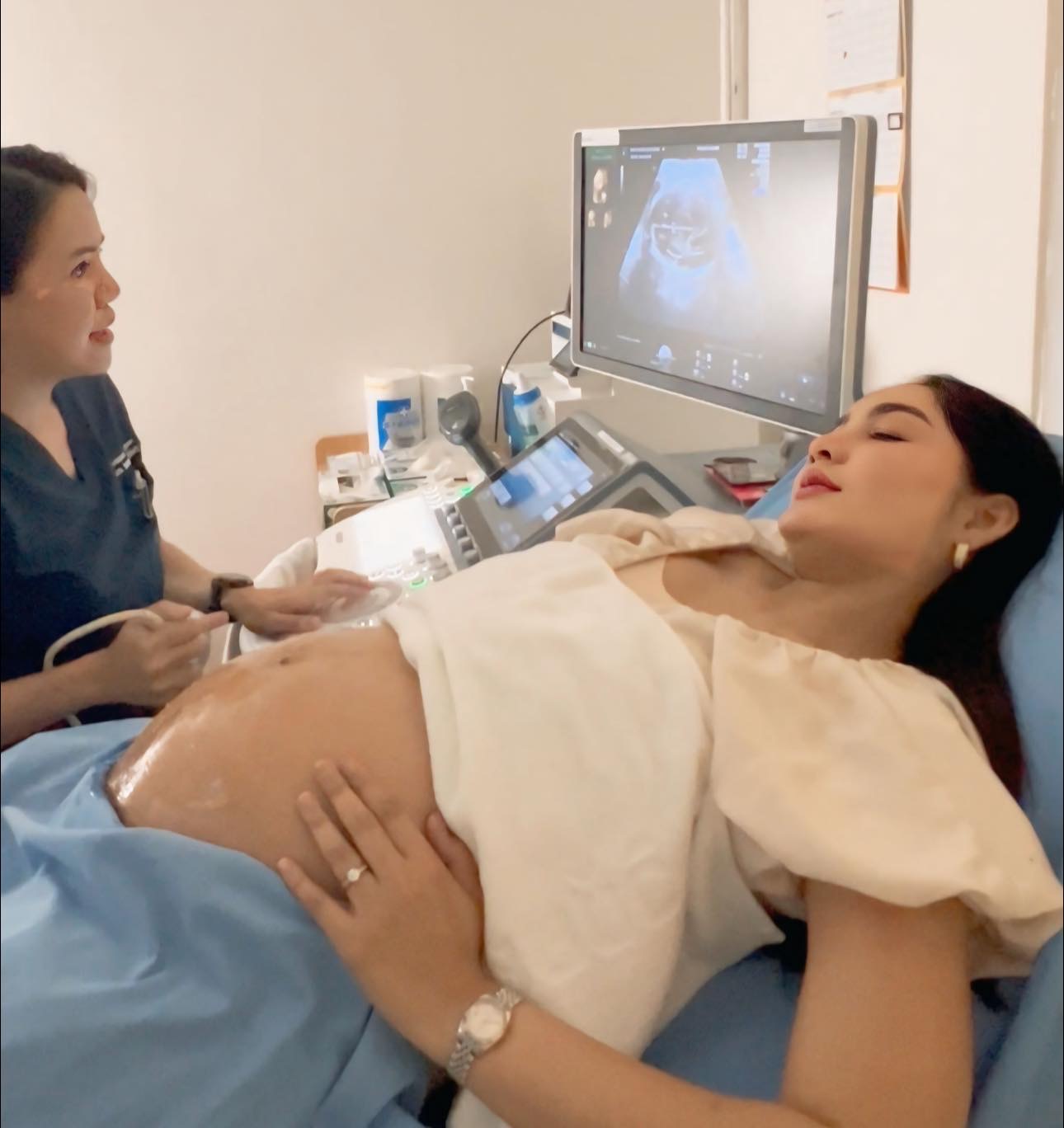 ผลตรวจจากแพทย์ระบุว่า น้ำหนักเบบี๋ 1,356 กรัม อยู่ในเกณฑ์มาตรฐาน ปริมาณน้ำคร่ำดี รกเกาะตำแหน่งปกติ และการไหลเวียนเลือดไปเลี้ยงสายสะดือดี โดยภาพรวมแพทย์ประเมินว่า สุขภาพของทารกในครรภ์แข็งแรงสมบูรณ์ดี