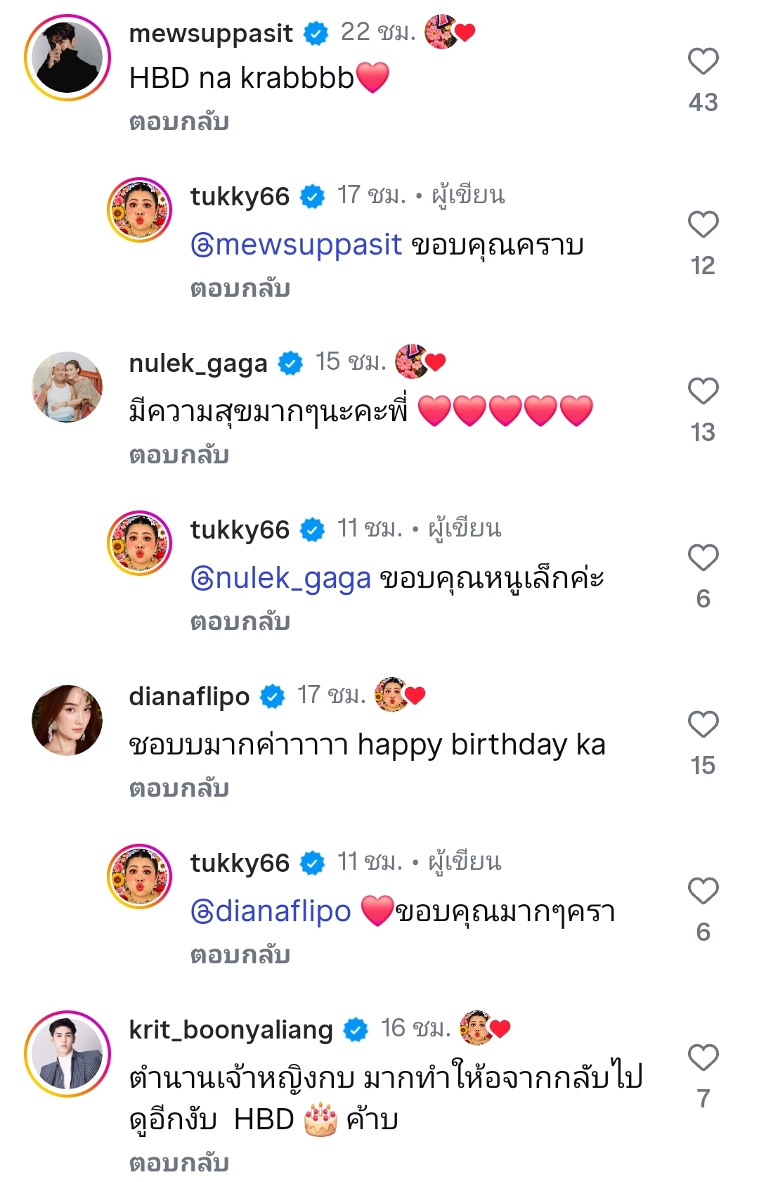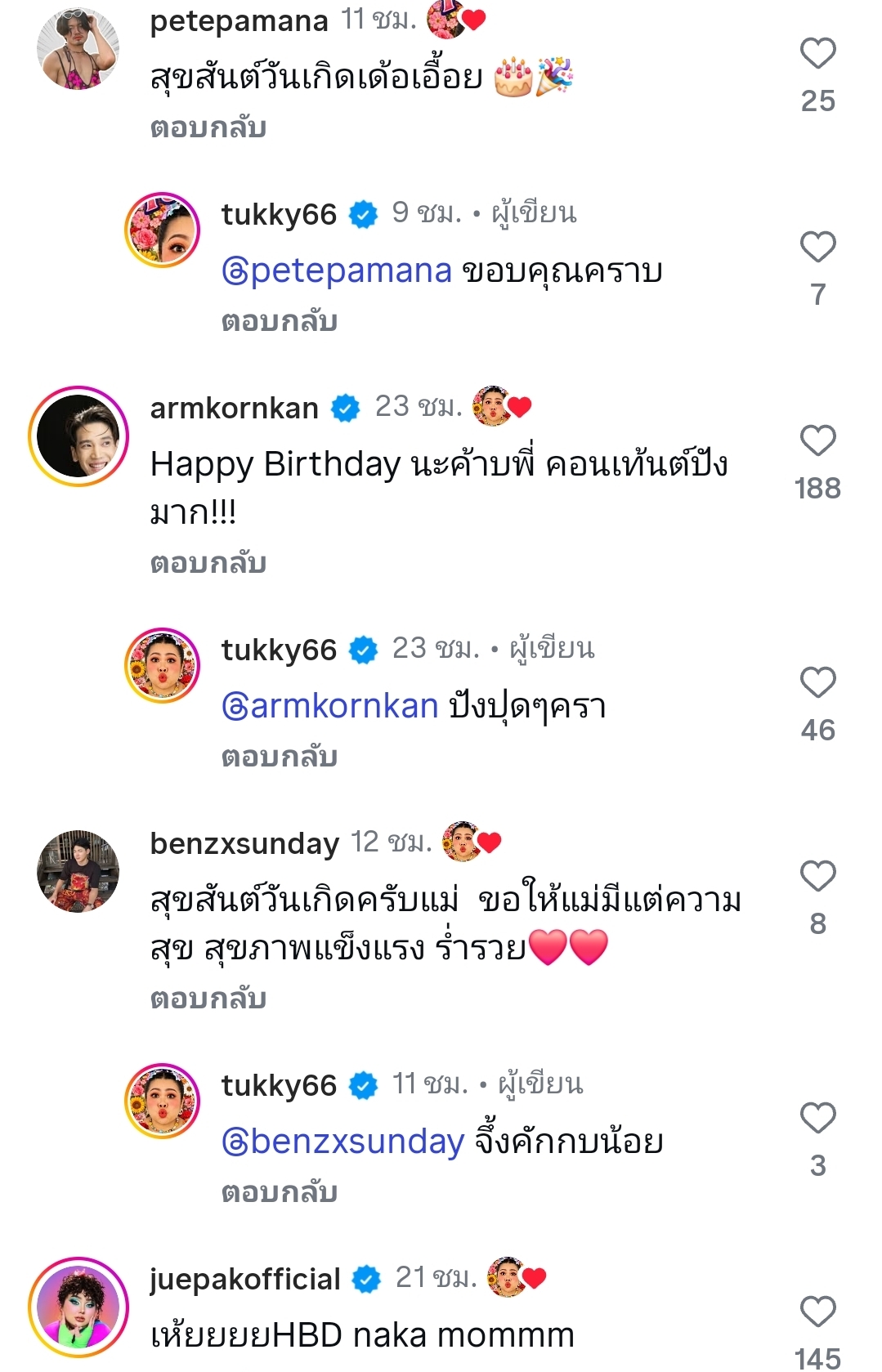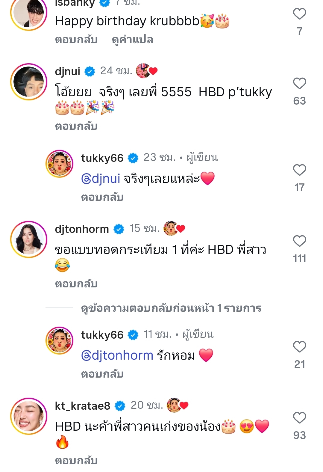 ​ทันทีที่คลิปถูกเผยแพร่ออกไป บรรดาเพื่อนพ้องน้องพี่ในวงการบันเทิงต่างพากันแห่เข้ามาคอมเมนต์กันถล่มทลาย ไม่ว่าจะเป็น ดีเจนุ้ย, ดีเจต้นหอม, กระแต อาร์สยาม, มิว ศุภศิษฏ์ และคนอื่นๆ อีกเพียบ ที่ต่างอวยพรวันเกิดและพูดเป็นเสียงเดียวกันว่า “ปังมาก!” และ “ทำถึงที่สุด!” โดยเฉพาะช็อตเด็ดในคลิปที่มีการแลบลิ้นยาวๆ ตามสไตล์กบ ทำเอาแฟนคลับขำกลิ้งแต่ก็ยอมใจในความทุ่มเทเทหมดหน้าตักของแม่ตุ๊กกี้จริงๆ ค่ะ