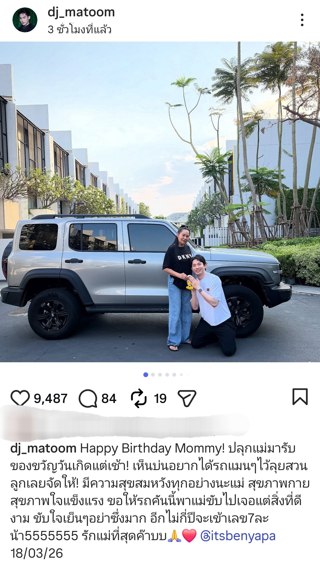 ​งานนี้ “ดีเจมะตูม” โพสต์ภาพสุดประทับใจผ่านอินสตาแกรมส่วนตัว เผยโมเมนต์นาทีนำพวงมาลัยไปไหว้ขอพรคุณแม่ พร้อมกับรถ SUV คันยักษ์สีบรอนซ์เทาสุดเท่ที่จอดรออยู่หน้าบ้าน โดยระบุแคปชั่นสุดน่ารักว่า: