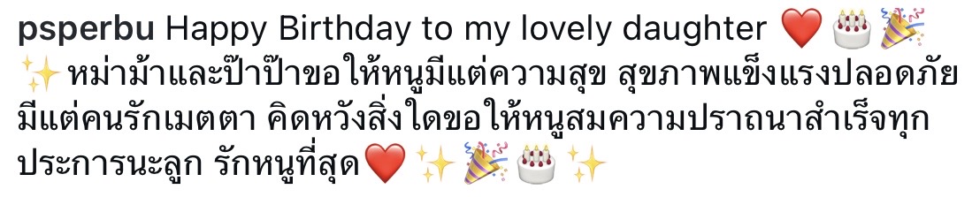 “Happy Birthday to my lovely daughter ❤️🎂🎉✨ หม่าม้าและป๊าป๊าขอให้หนูมีแต่ความสุข สุขภาพแข็งแรงปลอดภัย มีแต่คนรักเมตตา คิดหวังสิ่งใดขอให้หนูสมความปรารถนาสำเร็จทุกประการนะลูก รักหนูที่สุด ❤️✨🎉🎂✨”