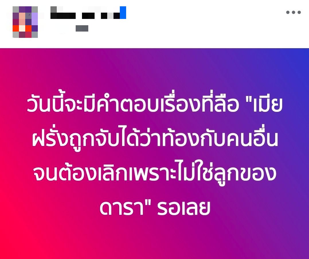 โดยล่าสุด พิธีกรดัง ได้โพสต์ข้อความปริศนาผ่านทางโซเชียลมีเดีย ระบุว่าในวันนี้จะมีการเปิดเผยคำตอบสำคัญเกี่ยวกับเรื่องราวที่มีการลือกันอย่างหนักว่า “เมียฝรั่งของดาราหนุ่มรายหนึ่ง ถูกจับได้ว่าตั้งครรภ์กับชายอื่น จนเป็นสาเหตุให้ต้องจบความสัมพันธ์และเลิกรากันไป เนื่องจากเด็กในท้องไม่ใช่ลูกของดาราดังคนดังกล่าว” ซึ่งข้อความนี้ทำให้ผู้ที่ติดตามข่าวสารต่างพากันคาดเดาไปต่างๆ นานาว่าดาราคนดังกล่าวคือใคร และความจริงเบื้องหลังเรื่องนี้คืออะไรกันแน่