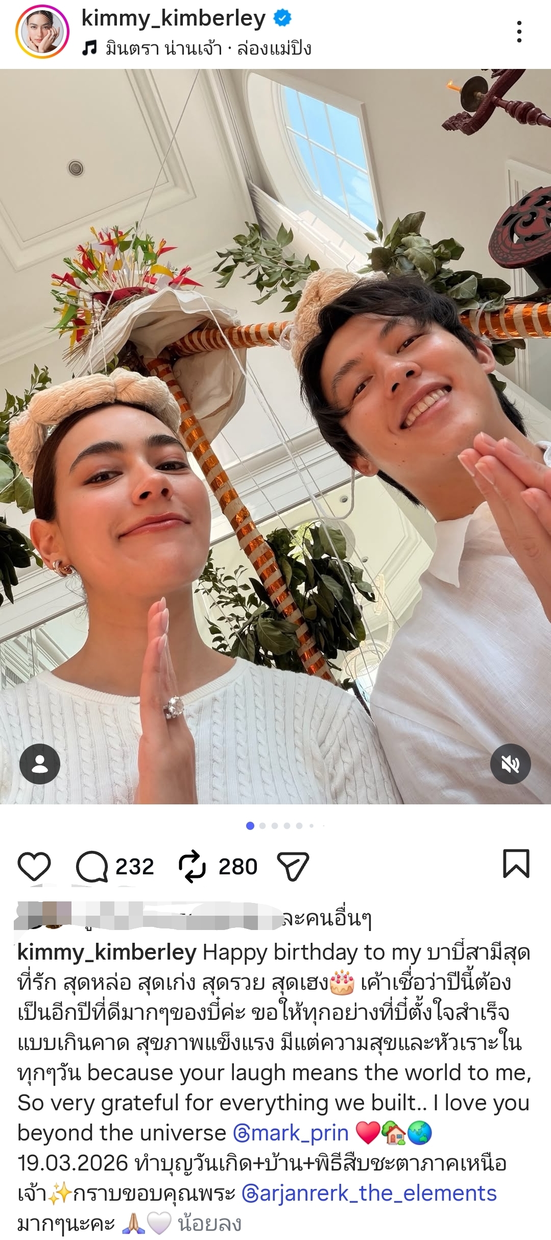แหม… หวานหยดย้อยขนาดนี้ มดไม่ขึ้นไอจีก็ให้มันรู้ไปค่ะ! แถมยังตบท้ายด้วยการขอบคุณอาจารย์ที่มาทำพิธีให้ และบอกเล่าเรื่องราวการทำบุญวันเกิดพ่วงไปกับการทำบุญบ้านและพิธีสืบชะตาอีกด้วย