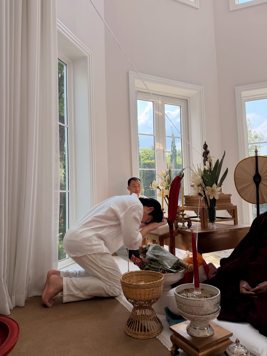 บรรยากาศภายในงานเต็มไปด้วยความศักดิ์สิทธิ์และอบอุ่นสุดๆ ค่ะ โดยหนุ่มหมากและสาวคิมมาในชุดสีขาวสะอาดตา ดูเรียบง่ายแต่โก้หรูสมฐานะ ซึ่งไฮไลท์ของงานนี้คือการจัด “พิธีสืบชะตาภาคเหนือ” ตามแบบฉบับล้านนาแท้ๆ มีการโยงด้ายสายสิญจน์และเครื่องประกอบพิธีกรรมทางเหนือแบบครบสูตร โดยมีครอบครัวของทั้งสองฝ่ายมาร่วมอนุโมทนาบุญกันอย่างพร้อมหน้าพร้อมตา เป็นภาพที่สะท้อนถึงความรักความผูกพันที่แน่นแฟ้นจริงๆ ค่ะ