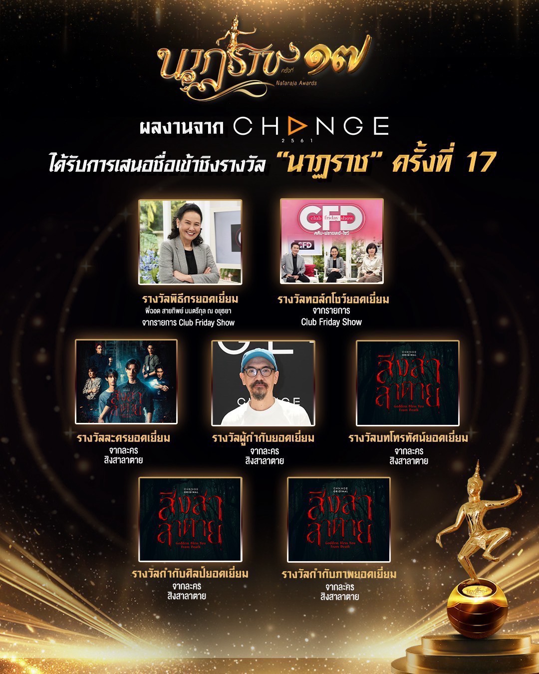 โดยทาง CHANGE2561 ขอขอบคุณสมาพันธ์สมาคมวิชาชีพวิทยุกระจายเสียงและวิทยุโทรทัศน์ ที่ให้เกียรติได้เข้าร่วมชิงรางวัลและขอแสดงความยินดีกับทุกผลงานที่ได้ร่วมเข้าชิงมา ณ ที่นี้ มาร่วมลุ้นและเชียร์ผลงานจาก CHANGE2561 ใน “นาฏราช” ครั้งที่ 17″ ประจำปี 2568 ในวันอาทิตย์ที่ 17 พฤษภาคม 2569 ณ สเฟียร์ฮอลล์ ชั้น 5 ศูนย์การค้าเอ็มสเฟียร์ และจะถ่ายทอดสดการประกาศผลทางสถานีโทรทัศน์ช่องวัน 31 (One 31) และสื่อออนไลน์ เพจนาฏราช และ oneD ตั้งแต่เวลา 18.30 น. เป็นต้นไป