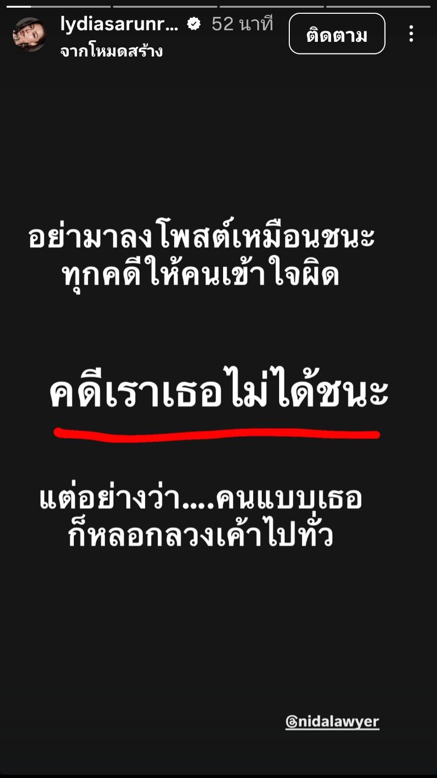 โดยในไอจีสตอรี่ของลีเดียได้ระบุข้อความไว้อย่างชัดเจนว่า “อย่ามาลงโพสต์เหมือนชนะทุกคดีให้คนเข้าใจผิด คดีเราเธอไม่ได้ชนะ” ซึ่งคำว่า “คดีเราเธอไม่ได้ชนะ” นั้นมีการขีดเส้นใต้สีแดงเน้นย้ำความสำคัญไว้อย่างชัดเจน เพื่อเป็นการยืนยันว่าสิ่งที่อีกฝ่ายพยายามสื่อสารให้สังคมเข้าใจนั้นอาจเป็นการบิดเบือนข้อเท็จจริง นอกจากนี้ลีเดียยังทิ้งท้ายด้วยประโยคเด็ดที่ทำเอาชาวเน็ตต้องรีบแคปหน้าจอไว้รัวๆ ว่า “แต่อย่างว่า…คนแบบเธอก็หลอกลวงเค้าไปทั่ว” พร้อมทั้งมีการแท็กชื่อบัญชีอินสตาแกรมของทนายความชื่อดังอย่าง @nidalawyer ไว้ที่มุมด้านล่างอีกด้วย