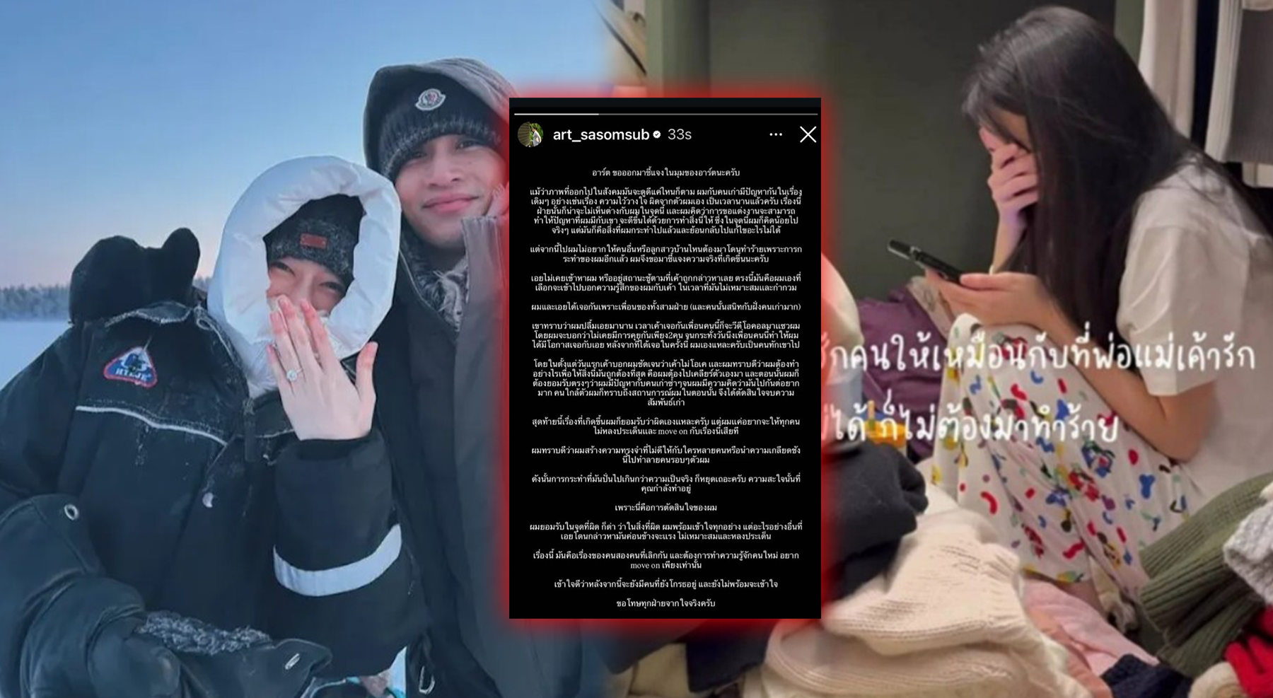 สำหรับประเด็นที่ถูกโยงไปถึงหญิงสาวรายใหม่ อาร์ตยืนยันชัดเจนว่า อีกฝ่ายไม่ได้เป็นผู้เข้ามาในลักษณะมือที่สามตามที่ถูกกล่าวหา แต่เป็นตนเองที่เป็นฝ่ายเริ่มต้นพูดคุยและแสดงความรู้สึกในช่วงเวลาที่ไม่เหมาะสม พร้อมยอมรับว่าการสื่อสารในช่วงนั้นมีความคลุมเครือ