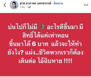 ล่าสุด 26 มีนาคม 69  นักร้องชื่อดังอย่าง ฮาย อาภาพร นครสวรรค์ ก็ได้โพสต์ข้อความผ่านเฟซบุ๊กระบุว่า  “บ่นไปก็ไม่มี 🐊 อะไรดีขึ้นมา มีสิทธิ์ได้แค่เห่าหอน ขึ้นมาได้ 6 บาท แล้วจะให้ทำยังไง? แม่X..ชีวิตพวกเราก็ต้องเดินต่อ  ไอ้ฉิXหาย !!!!”