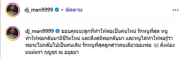 “ขอบคุณนะลูกที่ทำให้พ่อเป็นคนใหม่ รักหนูที่สุด หนูทำให้พ่อกลับมามีชีวิตใหม่ และดึงสติพ่อกลับมา และหนูได้ทำให้พ่อรู้ว่า พ่อจะไม่กลับไปเป็นคนเดิม รักหนูที่สุดลูกสาวคนเดียวของพ่อ”