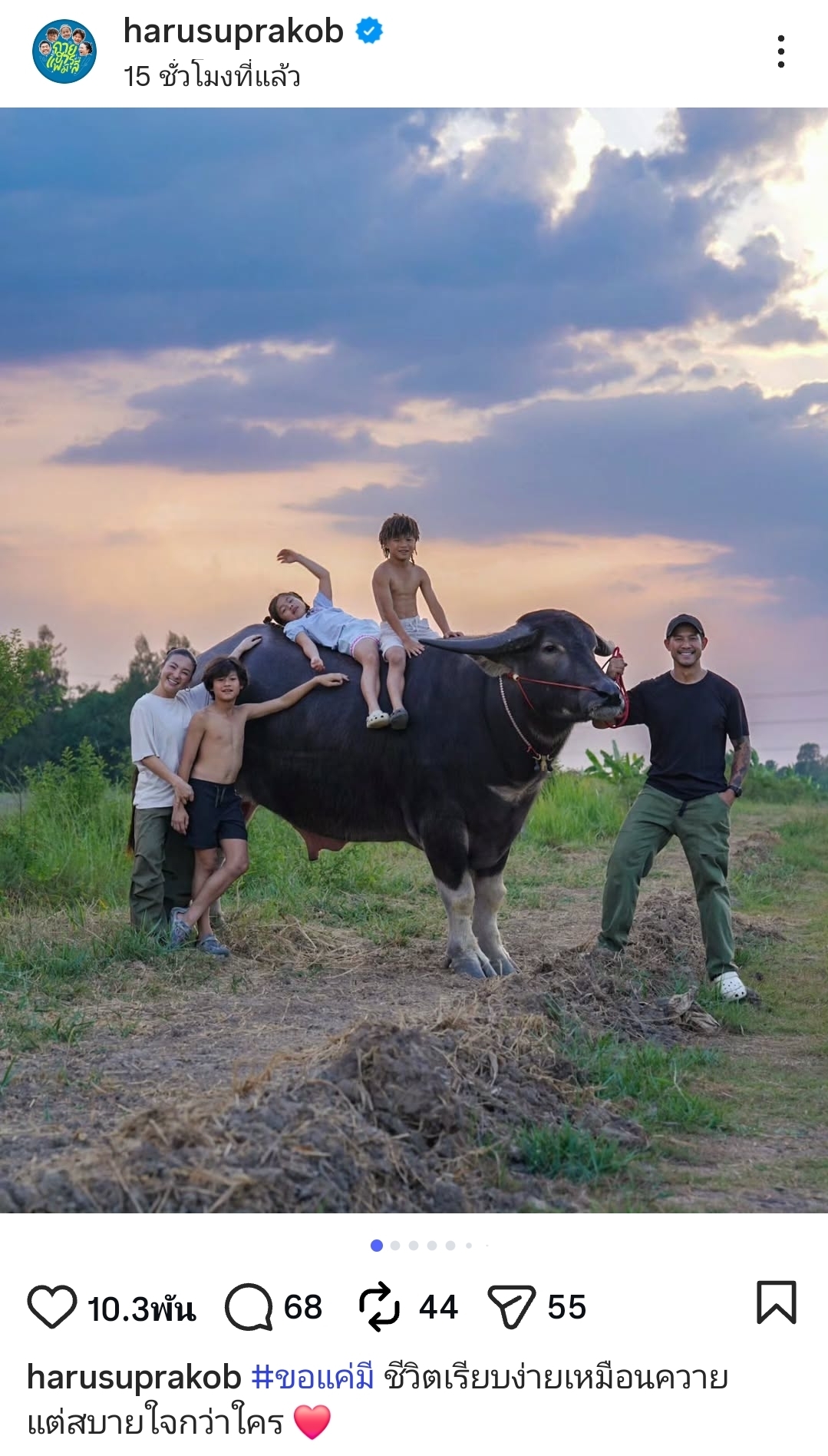 นอกจากรูปจะปังแล้ว คำคมแม่ฮารุก็ฟาดเรียบ! โดยระบุข้อความสั้นๆ แต่ลึกซึ้งว่า “#ขอแค่มี ชีวิตเรียบง่ายเหมือนควาย แต่สบายใจกว่าใคร ❤️” ซึ่งชาวเน็ตต่างแห่เข้ามากดไลก์และคอมเมนต์ชื่นชมในทัศนคติการเลี้ยงลูกของบ้านนี้ ว่าเป็นการสอนให้ลูกรู้จักความสุขที่แท้จริง ไม่ได้ยึดติดกับความหรูหรา แต่เน้นความอบอุ่นในครอบครัวเป็นหลัก