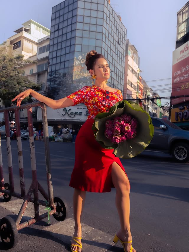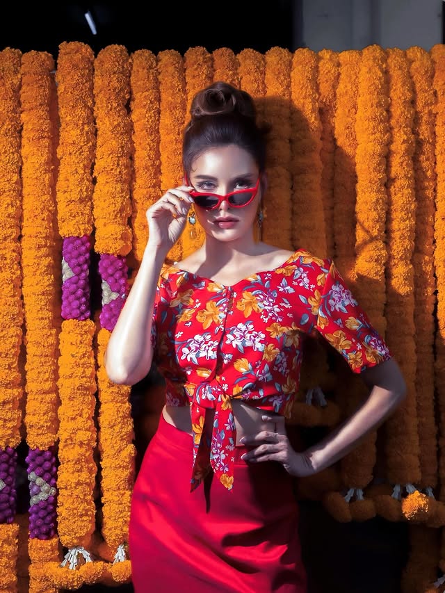 โดยลุคนี้มาในสไตล์ 50’s กับเสื้อครอปลายดอกสีแดงสด แมตช์กับกระโปรงทรงเข้ารูปสุดเป๊ะ เพิ่มความเก๋ด้วยแว่นกันแดดสีแดง และทรงผมรวบตึงแบบคลาสสิก แต่ที่ทำเอาสะดุดตาสุด ๆ คือพร็อพ “ดอกบัว” ที่เจ้าตัวถือโพสท่าแบบจัดเต็ม สร้างคอนทราสต์ระหว่างความไทยกับแฟชั่นยุคใหม่ได้อย่างลงตัว