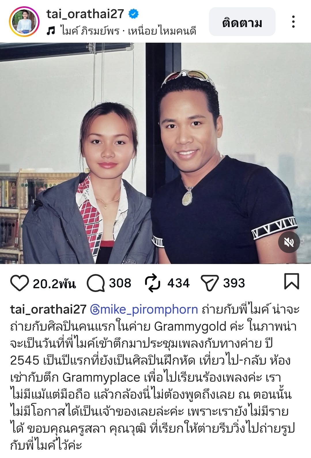 ภาพแรกทำเอาแฟนๆ ซึ้งน้ำตาซึมค่ะ เมื่อสาวต่ายลงรูปคู่กับลูกทุ่งรุ่นพี่ “พี่ไมค์ ภิรมย์พร” ย้อนกลับไปเมื่อปี 2545 นู่นนนน! สมัยเธอยังเป็นแค่ “ศิลปินฝึกหัด” นั่งรถเมล์เทียวไปเทียวมาห้องเช่ากับตึกแกรมมี่เพลส เพื่อมาเรียนร้องเพลง
