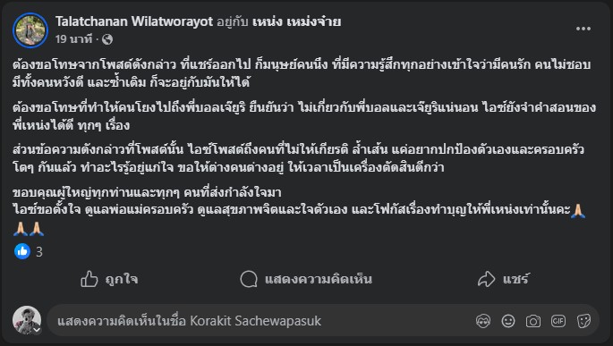 เจ้าตัวยังขอให้เรื่องราวต่าง ๆ จบลง และต่างคนต่างอยู่ โดยเชื่อว่า “เวลา” จะเป็นเครื่องพิสูจน์ พร้อมขอบคุณทุกกำลังใจจากผู้ใหญ่และผู้ที่เข้าใจ