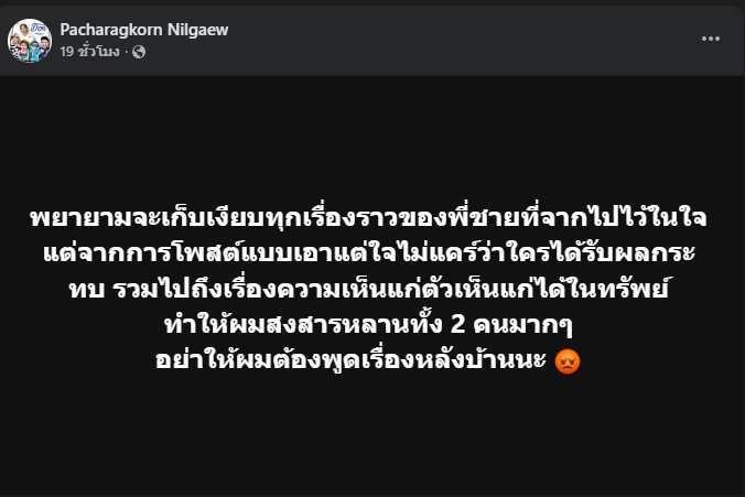 “พยายามจะเก็บเงียบทุกเรื่องราวของพี่ชายที่จากไปไว้ในใจ แต่จากการโพสต์แบบเอาแต่ใจไม่แคร์ว่าใครได้รับผลกระทบ รวมไปถึงเรื่องความเห็นแก่ตัวเห็นแก่ได้ในทรัพย์ ทำให้ผมสงสารหลานทั้ง 2 คนมากๆ อย่าให้ผมต้องพูดเรื่องหลังบ้านนะ”