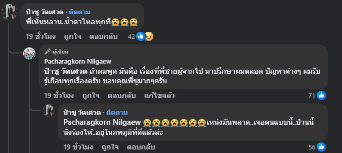 ต่อมา ป๋าชู วัดเศวต ก็เข้ามาคอมเมนต์ใต้โพสต์ว่า “พี่เห็นหลาน..น้ำตาไหลทุกที” ซึ่ง ดอน ก็ตอบคอมเมนต์ด้วยว่า “ถ้าผมพูด มันคือ เรื่องที่พี่ชายผู้จากไป มาปรึกษาผมตลอด ปัญหาต่างๆ ผมรับรู้เกือบทุกเรื่องครับ ขอบคุณพี่ชูมากๆครับ”