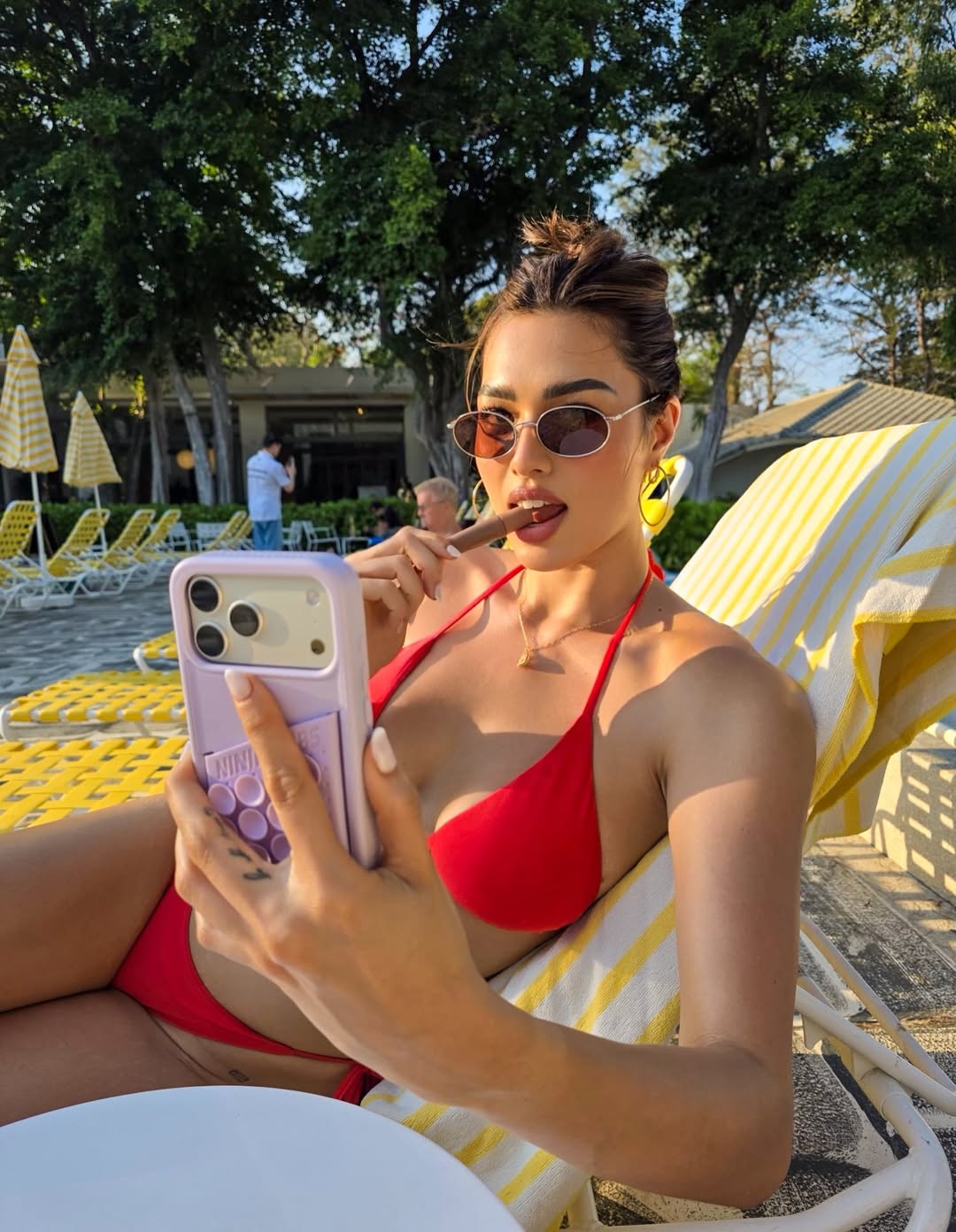 ในเซ็ตภาพล่าสุดนี้ สาวแอนชิลีได้จัดเต็มเสิร์ฟความเซ็กซี่ที่มาพร้อมกับความมั่นใจและเสน่ห์อันล้นเหลือ เริ่มตั้งแต่ช็อตเซลฟี่หน้ากระจกในห้องน้ำที่เผยให้เห็นสัดส่วนโค้งเว้าสุดเป๊ะแบบไม่ต้องพึ่งฟิลเตอร์ ไปจนถึงโมเมนต์ชิลๆ ริมสระว่ายน้ำที่เธอนอนอาบแดดบนเก้าอี้ผ้าใบ โชว์ผิวสีแทนเนียนสวยที่ตัดกับสีแดงจี๊ดของชุดบิกินี่ได้อย่างลงตัวสุดๆ นอกจากความแซ่บแล้ว เธอยังแฝงความขี้เล่นและสดใสตามสไตล์ ด้วยการโพสท่าเผลอๆ ดูดเครื่องดื่ม ทานขนม พร้อมกับหยิบแว่นกันแดดทรงชิคมาคาดผม และแจกรอยยิ้มกว้างที่ใครเห็นเป็นต้องใจละลาย