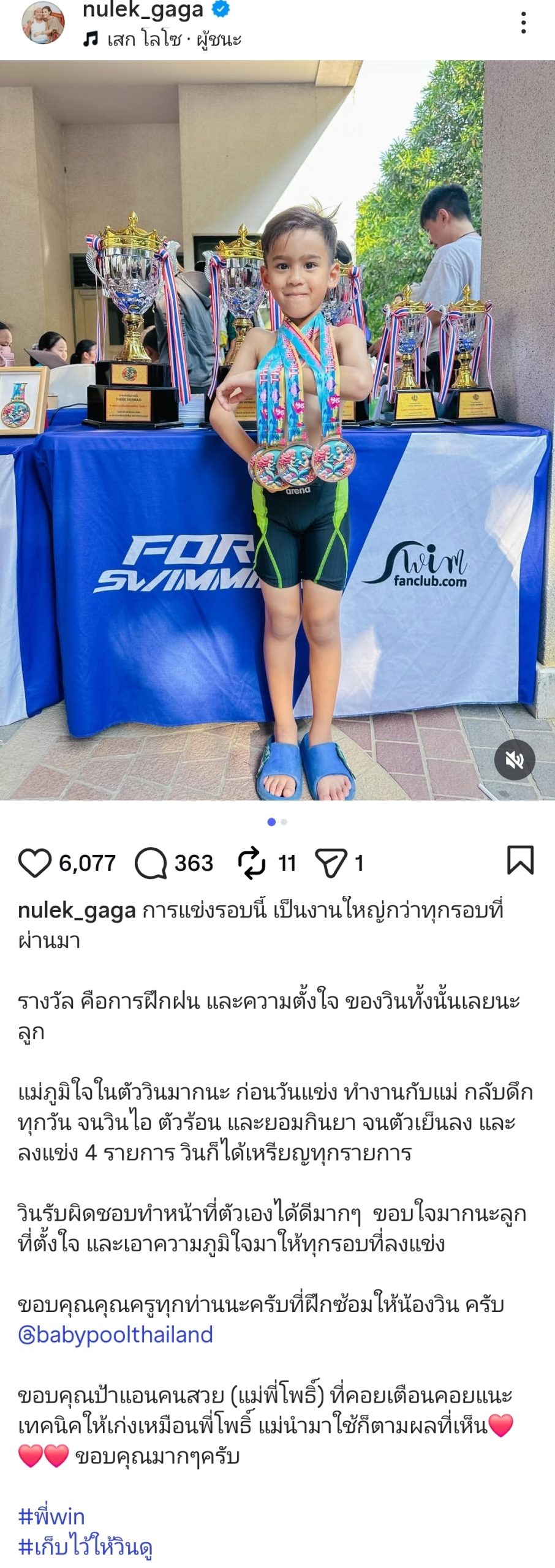 คุณแม่หนูเล็กโพสต์ภาพน้องวินยืนยิ้มแป้นพร้อมเหรียญรางวัลระยิบระยับเต็มคอ โดยระบุว่าการแข่งครั้งนี้เป็นงานใหญ่กว่าทุกครั้งที่ผ่านมา และน้องวินก็ไม่ทำให้ผิดหวัง ลงแข่งไปทั้งหมด 4 รายการ ก็กวาดเหรียญกลับบ้านมาได้ครบทุกรายการ! ทำเอาหัวใจคนเป็นแม่พองโตแบบฉุดไม่อยู่