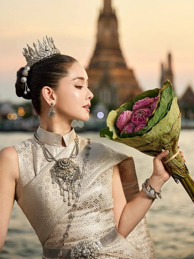 🌿 ชุดไทยสีเงินที่สวมใส่ ยิ่งช่วยขับผิวให้ดูเปล่งประกาย เล่นกับแสงยามเย็นริมแม่น้ำ บอกเลยว่าแต่ละช็อตเหมือนหลุดออกมาจากแฟชั่นเซ็ตระดับแมกกาซีน! แถมเครื่องประดับจัดเต็ม ทั้งมงกุฎและสร้อยคอ ยิ่งเพิ่มความอลังการเข้าไปอีกขั้น