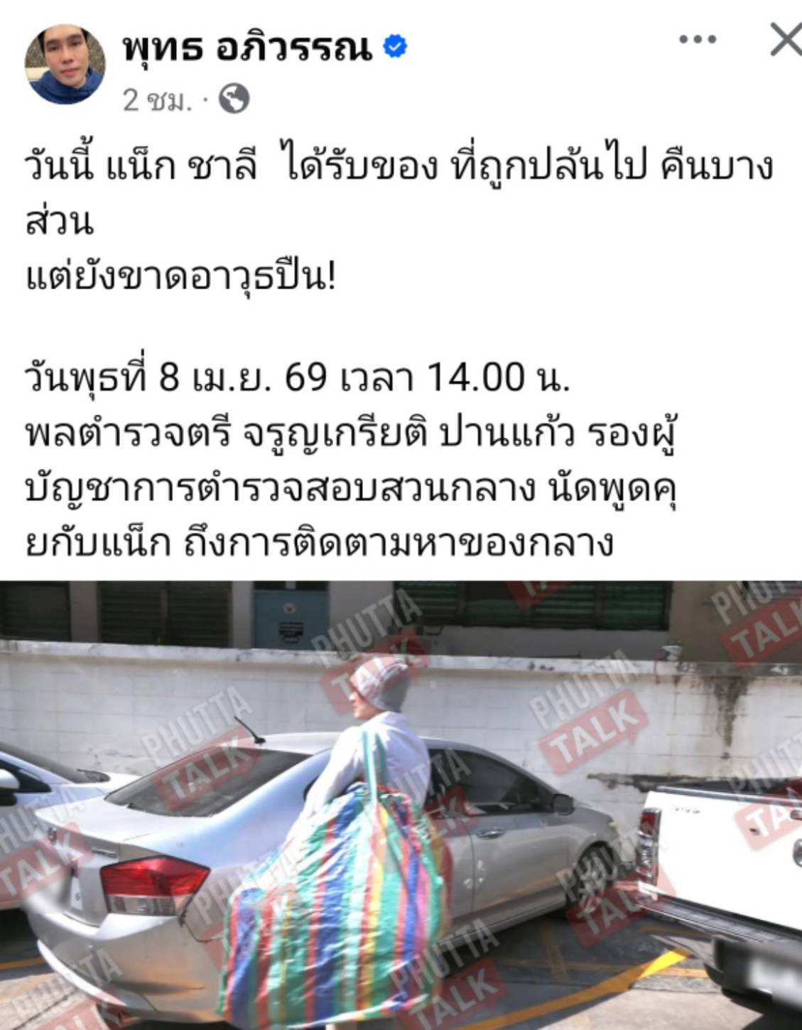ความคืบหน้ากรณีของนักแสดงหนุ่มอารมณ์ดี แน็ก ชาลี ปอทเจส หลังตกเป็นเหยื่อเหตุปล้นทรัพย์ ล่าสุดมีรายงานว่าเจ้าตัวได้รับทรัพย์สินคืนมาแล้วบางส่วน แต่ยังคงมีของสำคัญสูญหาย โดยเฉพาะ “อาวุธปืน” ที่ยังไม่พบร่องรอย