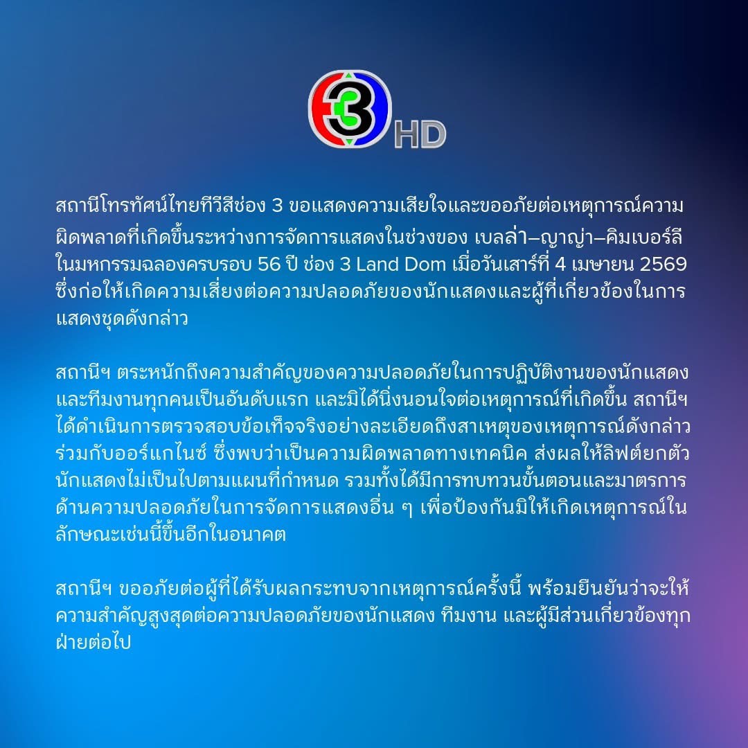 สถานีโทรทัศน์ไทยทีวีสีช่อง 3 ออกแถลงการณ์แสดงความเสียใจและขออภัยต่อเหตุการณ์ความผิดพลาดที่เกิดขึ้นระหว่างการจัดการแสดงในช่วงของ เบลล่า–ญาญ่า–คิมเบอร์ลี ภายในงานฉลองครบรอบ 56 ปี “ช่อง 3 Land of Love” เมื่อวันเสาร์ที่ 4 เมษายน 2569 ซึ่งเหตุการณ์ดังกล่าวได้ก่อให้เกิดความเสี่ยงต่อความปลอดภัยของนักแสดงและผู้ที่เกี่ยวข้อง