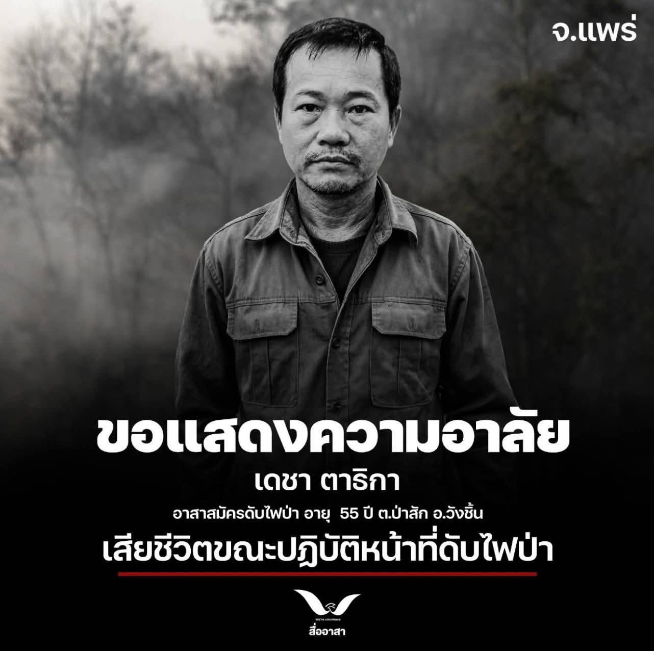 เรียกได้ว่าเป็นเรื่องราวที่บีบหัวใจคนไทยทั้งประเทศจริงๆ ค่ะ เมื่อต้องมาสูญเสีย “คุณเดชา ตาธิกา” วีรบุรุษผู้ปิดทองหลังพระวัย 55 ปี อาสาสมัครดับไฟป่าบ้านปางไม้ จ.แพร่ ที่ต้องจากไปอย่างไม่มีวันกลับ ขณะปฏิบัติหน้าที่ดับไฟป่าในเขตติดต่ออุทยานแห่งชาติเวียงโกศัย เมื่อวันที่ 4 เมษายน ที่ผ่านมา!