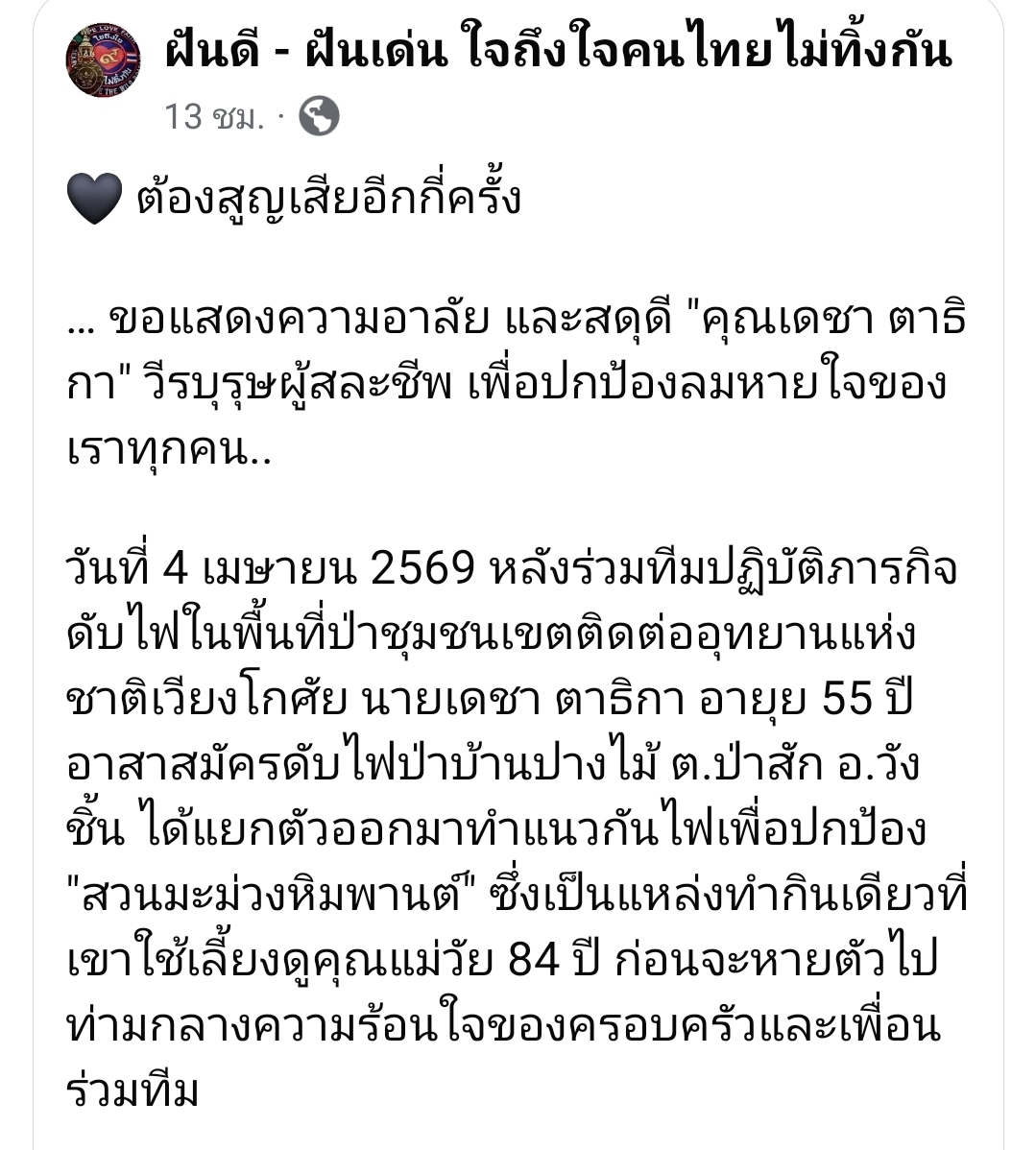 นาทีบีบหัวใจ! แหล่งข่าวรายงานว่า หลังจากคุณเดชาเสร็จสิ้นภารกิจร่วมกับทีมงาน แกได้แยกตัวไปทำแนวกันไฟเพื่อหวังปกป้อง “สวนมะม่วงหิมพานต์” ซึ่งเป็นรายได้เพียงทางเดียวที่ใช้เลี้ยงดู “แม่เฒ่านวล” คุณแม่วัย 84 ปี ก่อนจะหายตัวไปอย่างปริศนา ท่ามกลางความร้อนใจของครอบครัวและเจ้าหน้าที่ที่ระดมกำลังออกตามหากันจนมืดค่ำ!