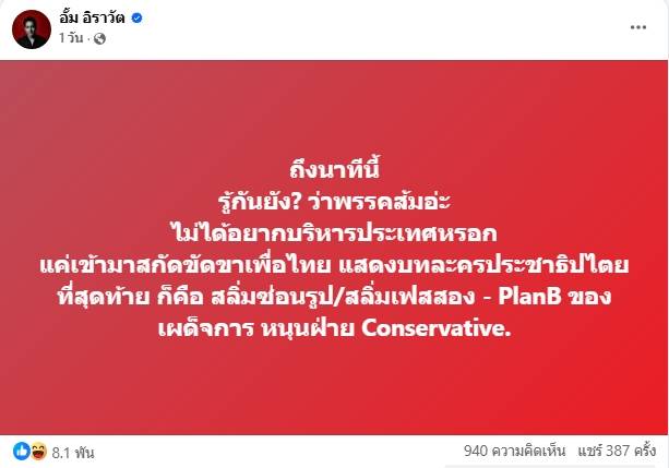 ”ถึงนาทีนี้ รู้กันยัง? ว่าพรรคส้มอ่ะ ไม่ได้อยากบริหารประเทศหรอก แค่เข้ามาสกัดขัดขาเพื่อไทย แสดงบทละครประชาธิปไตย ที่สุดท้าย ก็คือ สลิ่มซ่อนรูป/สลิ่มเฟสสอง – Plan B ของเผด็จการ หนุนฝ่าย Conservative”