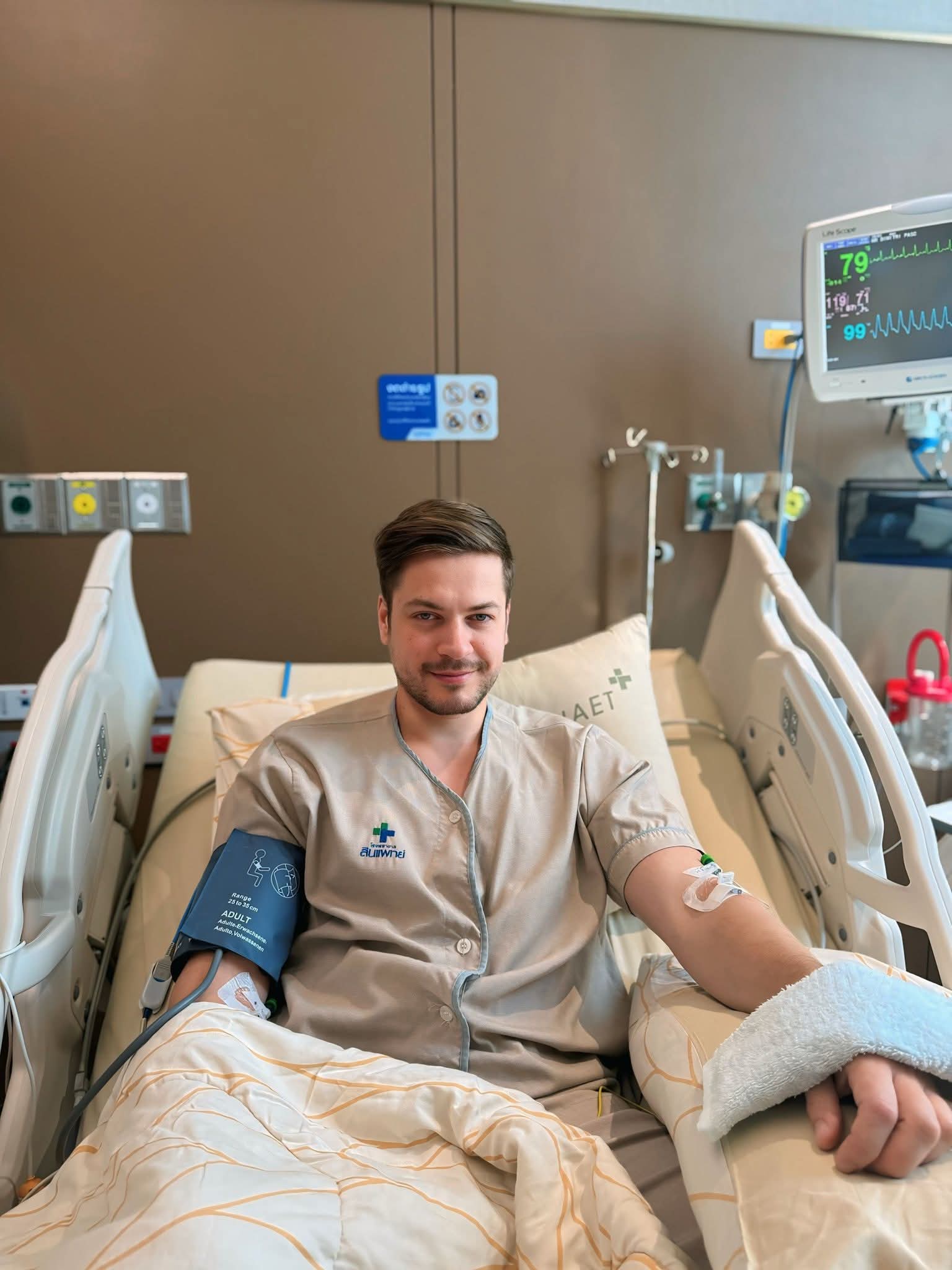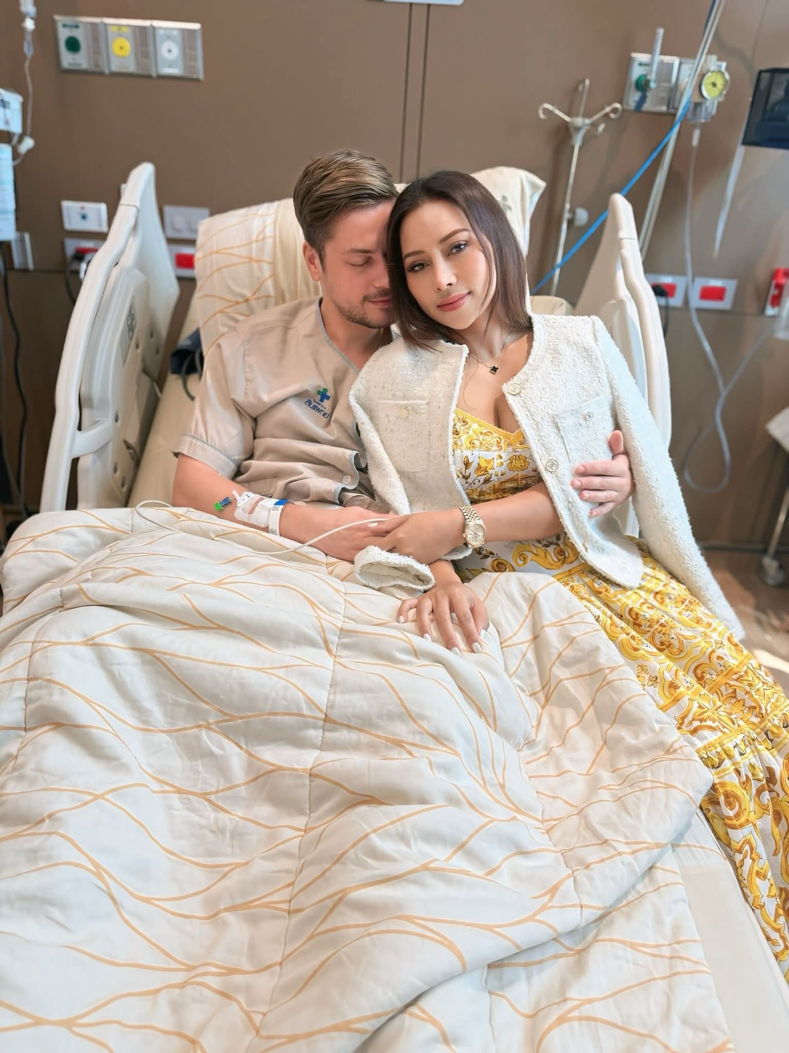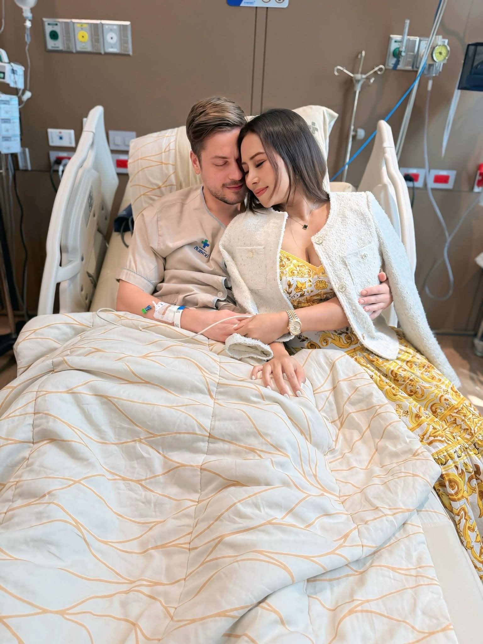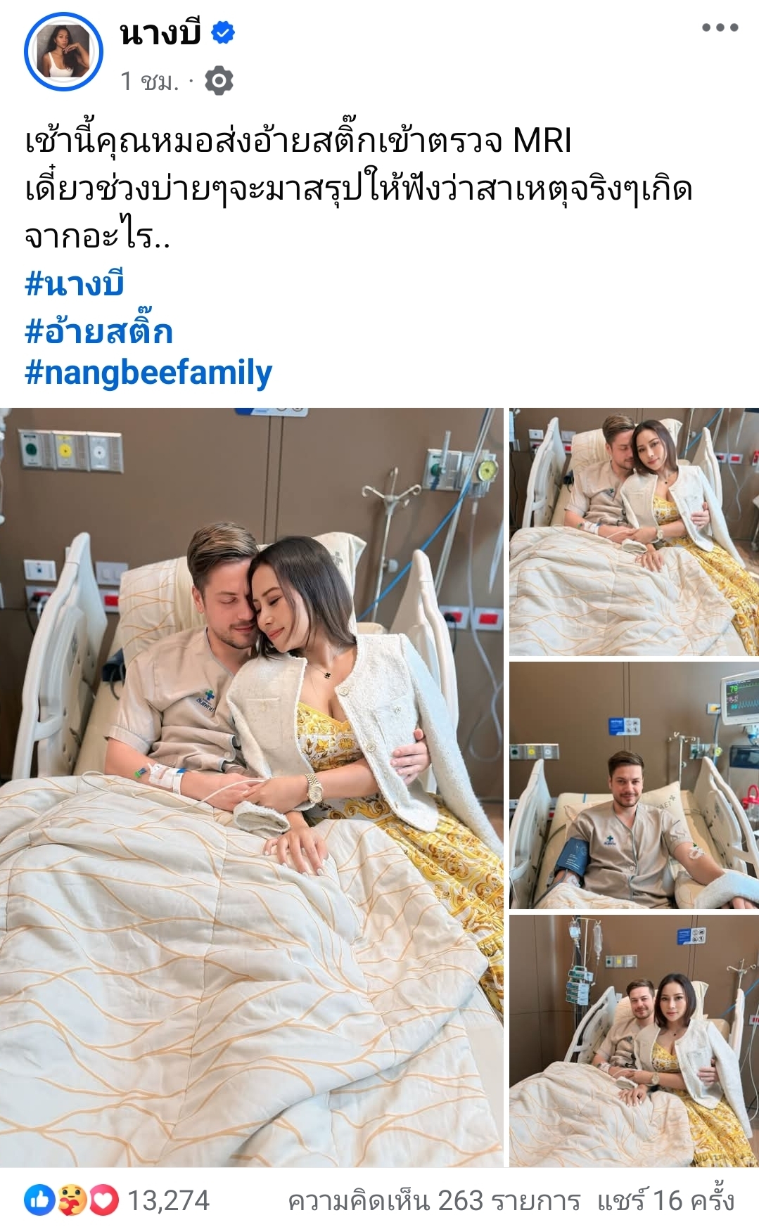 ล่าสุด นางบี ได้โพสต์ภาพคู่ขณะเฝ้าไข้สามี พร้อมข้อความสุดกังวลว่า… ”เช้านี้คุณหมอส่งอ้ายสติ๊กเข้าตรวจ MRI เดี๋ยวช่วงบ่ายๆ จะมาสรุปให้ฟังว่าสาเหตุจริงๆ เกิดจากอะไร..”