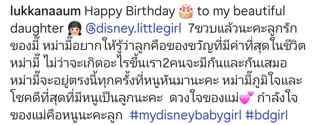 แม่อุ้ม ลักขณา ก็ได้โพสต์คลิปน้องดิสนีย์ ผ่านอินสตาแกรมส่วนตัว เผยโมเมนต์น่ารักๆ ตั้งแต่เริ่มแปลงโฉมจนเสร็จ พร้อมกับเขียนข้อความอวยพรวันเกิดสุดซึ้งถึงลูกสาวว่า “Happy Birthday🎂 to my beautiful daughter 👧🏻 @disney.littlegirl 7ขวบแล้วนะคะลูกรัก ของมี๊ หม่ามี๊อยากให้รู้ว่าลูกคือของขวัญที่มีค่าที่สุดในชีวิตหม่ามี๊ ไม่ว่าจะเกิดอะไรขึ้นเรา2คนจะมีกันและกันเสมอ หม่ามี๊จะอยู่ตรงนี้ทุกครั้งที่หนูหันมานะคะ หม่ามี๊ภูมิใจและโชคดีที่สุดที่มีหนูเป็นลูกนะคะ ดวงใจของแม่💗 กำลังใจของแม่คือหนูนะคะลูก #mydisneybabygirl #bdgirl”
