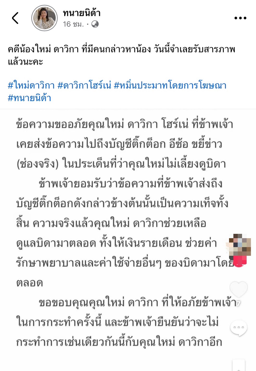 เรียกว่าจบดราม่าแบบชัดเจน! สำหรับกรณีที่นางเอกสาว ใหม่ ดาวิกา โฮร์เน่ ถูกโยงเป็น “นางเอกไม่เลี้ยงดูพ่อ” จนกลายเป็นกระแสวิพากษ์วิจารณ์อย่างหนักในโลกออนไลน์ตั้งแต่ช่วงต้นปีที่ผ่านมา