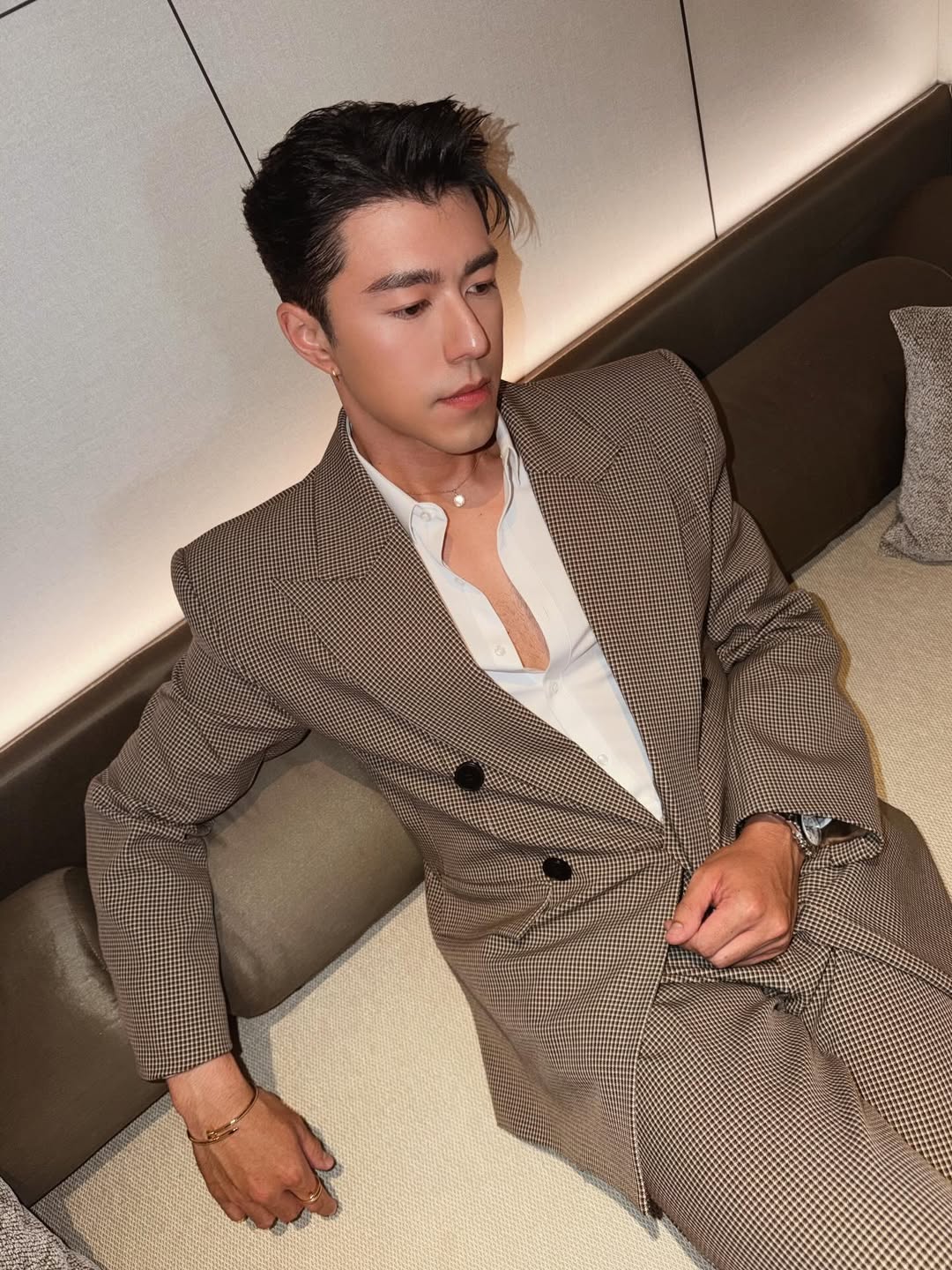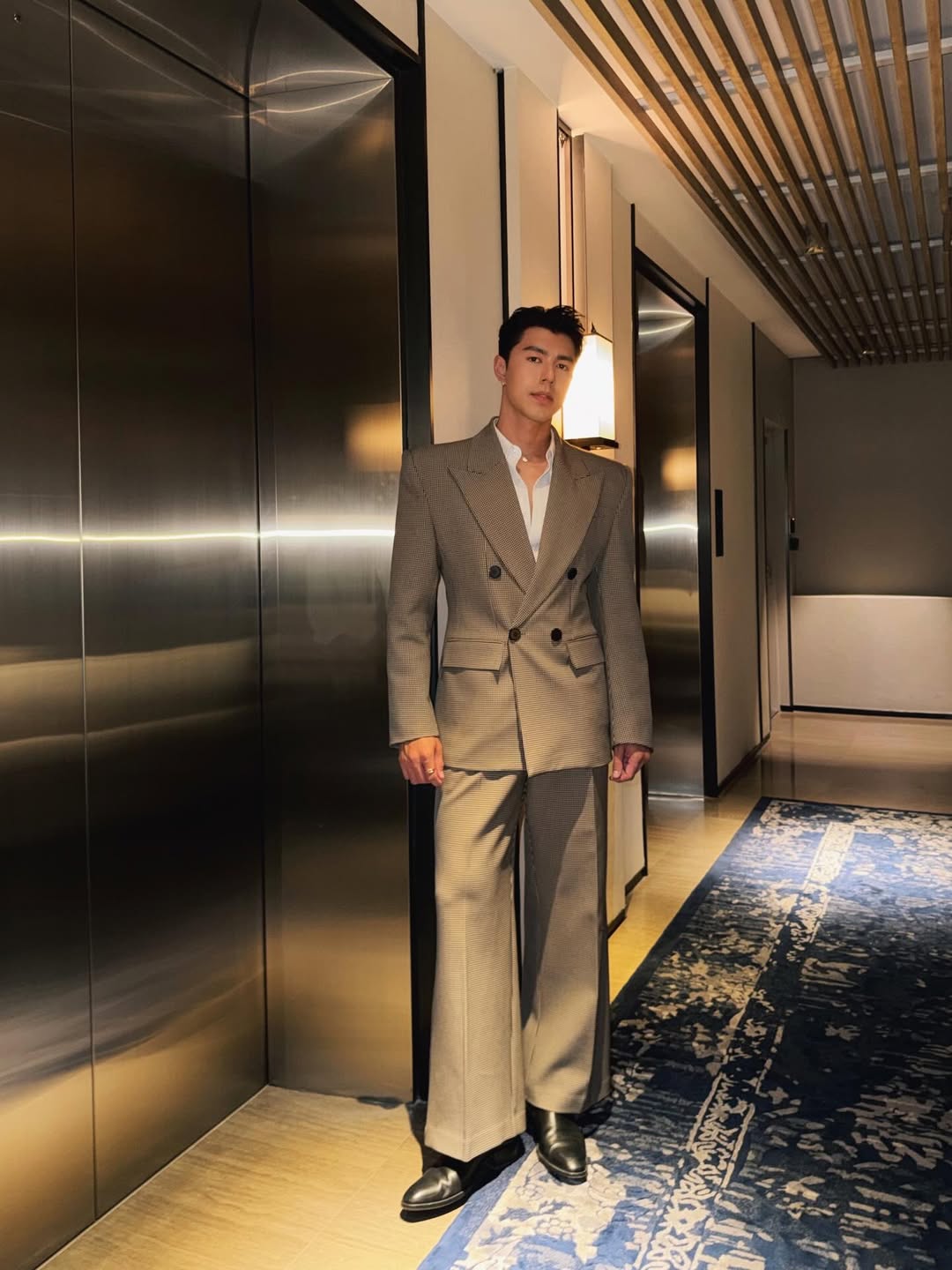โดยเจ้าตัวมาในชุดสูทโทนน้ำตาลลายคลาสสิก แมตช์กับเสื้อเชิ้ตสีขาวที่ปลดกระดุมเล็กน้อย เผยลุคหนุ่มฮอตแบบไม่ต้องพยายาม เสริมความดูดีด้วยเครื่องประดับเรียบๆ อย่างสร้อยคอและต่างหู ช่วยให้ลุคโดยรวมดูแพงและมีสไตล์มากยิ่งขึ้น