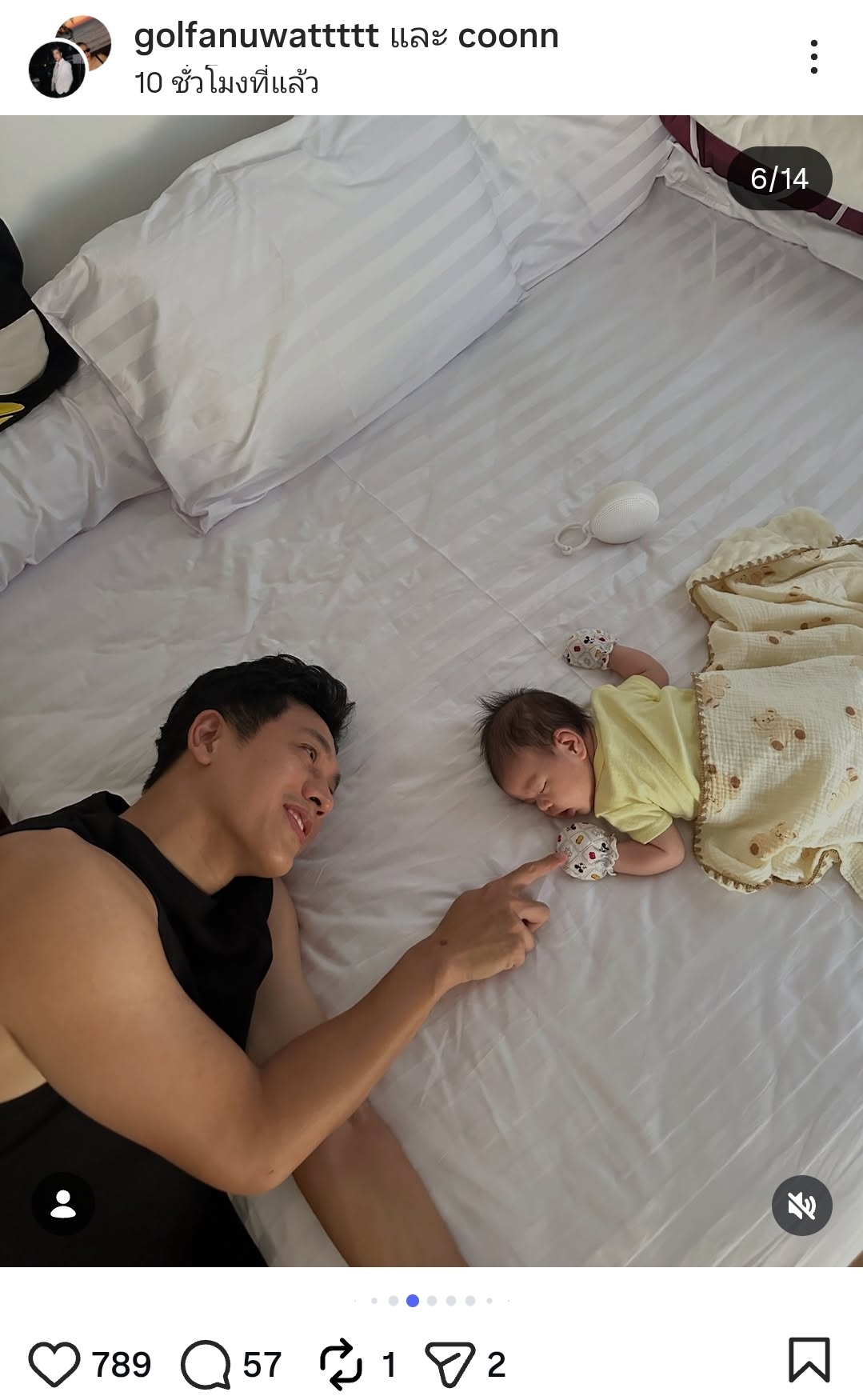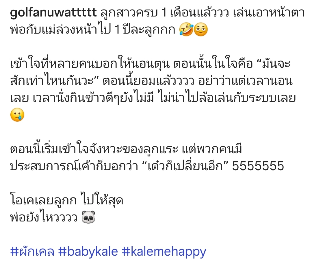 โถ่… เอ็นดูคุณพ่อมากค่ะ ถึงขั้นยอมรับว่าไม่น่าไปล้อเล่นกับระบบเด็กทารกเลยจริงๆ แต่ถึงจะเพลียแค่ไหน ในภาพที่หนุ่มกอล์ฟอุ้มลูกน้อย หรือตอนแอบมองลูกหลับ มันช่างเป็นภาพที่ละมุนต่อใจเหลือเกิน ความรักมันล้นอกอะเนอะคุณพ่อ ถึงหน้าจะไปก่อนอายุสัก 1 ปี (ตามที่เจ้าตัวแกงตัวเอง) แต่เชื่อว่าคุณพ่อกอล์ฟยังไหว… ไปให้สุดเลยลูกก!