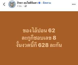 โดยแม่น้ำหนึ่ง เผยที่มาขอบเลขเด็ดงวดนี้ โดยระบุข้อความว่า ของไอ้ปอน 62 ละกูก็ชอบเลข 8 งั้นงวดนี้ก็ 628 ละกัน เรียกได้ว่า หลังออกมาโพสต์แบบนี้ทำเอาคอเลขเด็ดต่างพากันฮือฮาเลยทีเดียว