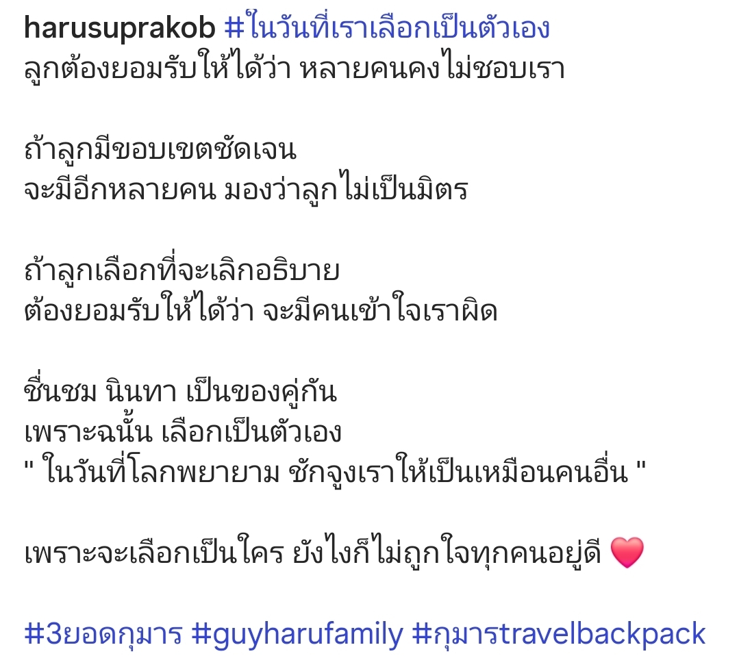 งานนี้สิ่งที่สะดุดตาและทัชใจที่สุด คือโพสต์คำคมสุดจี๊ดของแม่ฮารุที่ระบุว่า “ในวันที่เราเลือกเป็นตัวเอง ลูกต้องยอมรับให้ได้ว่า หลายคนคงไม่ชอบเรา… เพราะจะเลือกเป็นใคร ยังไงก็ไม่ถูกใจทุกคนอยู่ดี” ซึ่งถือเป็นการสอนลูกที่ลึกซึ้งและจริงที่สุดในยุคนี้เลยทีเดียว