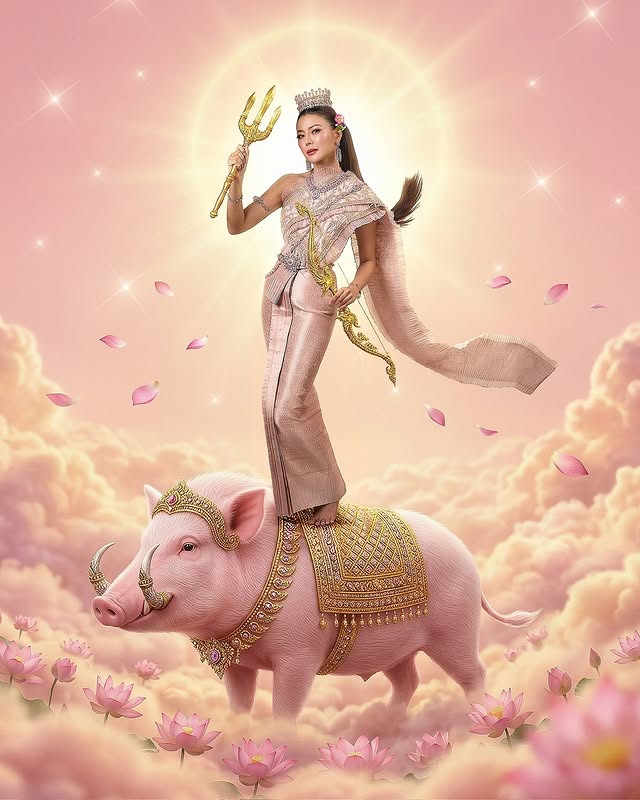ไฮไลต์สำคัญอยู่ที่การตีความ “นางรากษสเทวี” ในแบบร่วมสมัย ที่ผสมผสานความอ่อนหวานเข้ากับความแข็งแกร่งได้อย่างมีเอกลักษณ์ อีกทั้งยังเพิ่มความแฟนตาซีด้วยพาหนะคู่กายอย่างหมู สะท้อนปีนักษัตรได้อย่างสร้างสรรค์