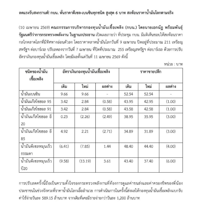 การปรับลดราคาดังกล่าวจะมีผลตั้งแต่วันที่ 11 เมษายน 2569 เวลา 05.00 น. เป็นต้นไป โดยเป็นผลจากการปรับอัตราเงินกองทุนน้ำมันเชื้อเพลิงให้สอดคล้องกับสถานการณ์ราคาน้ำมันในตลาดโลกที่ปรับตัวลดลง